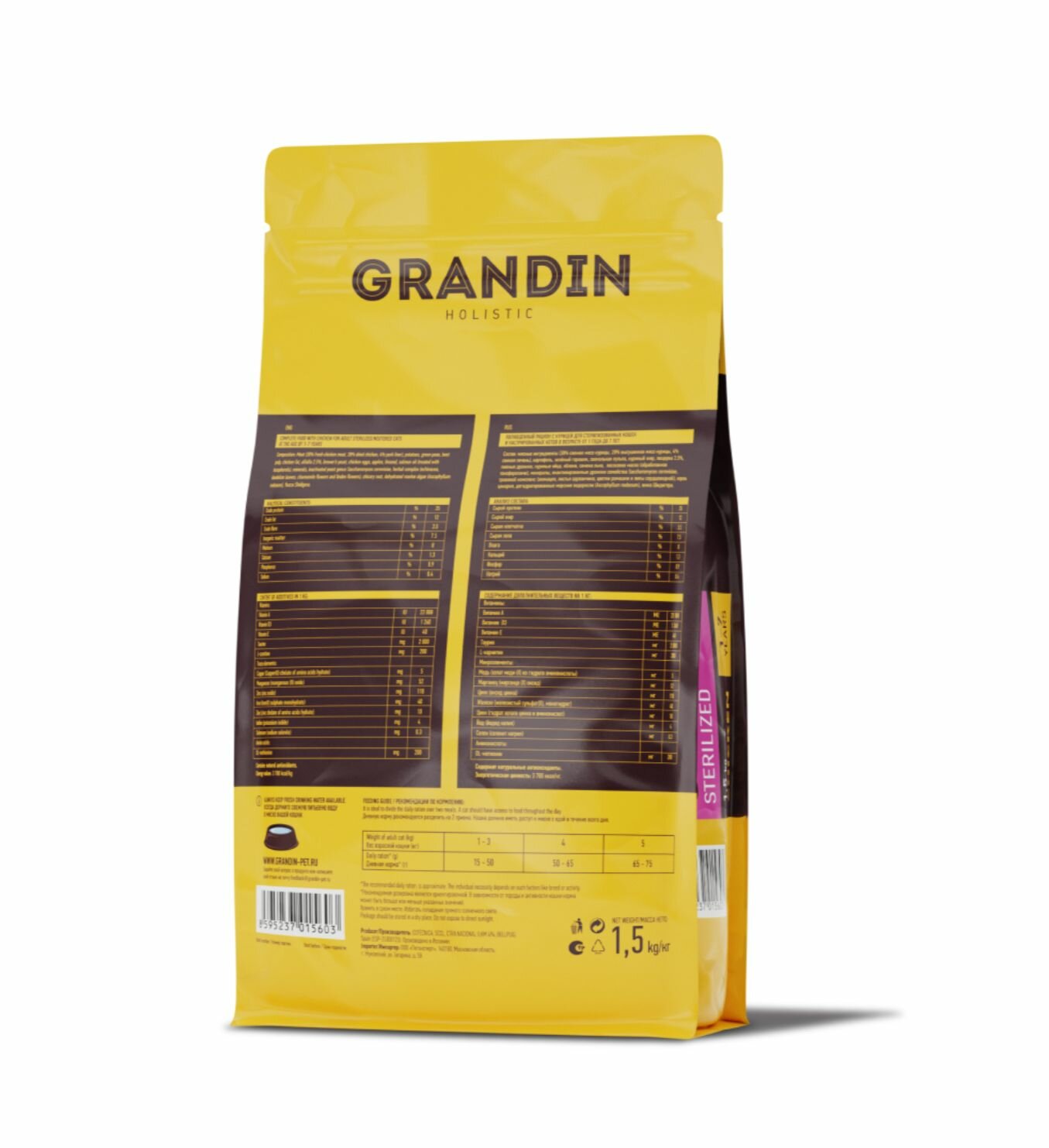 GRANDIN Holistic Sterilized — это полноценный корм для кастрированных котов и стерилизованных кошек в возрасте от 1 года до 7 лет. Содержит специальные ингредиенты, такие как Dl-метионин (аминокислота для профилактики мочекаменной болезни), L-карнитин (ускоряет расщепление жира и помогает поддерживать вес в норме). Низкокалорийная формула разработана специально для профилактики мочекаменной болезни у животных после стерилизации.