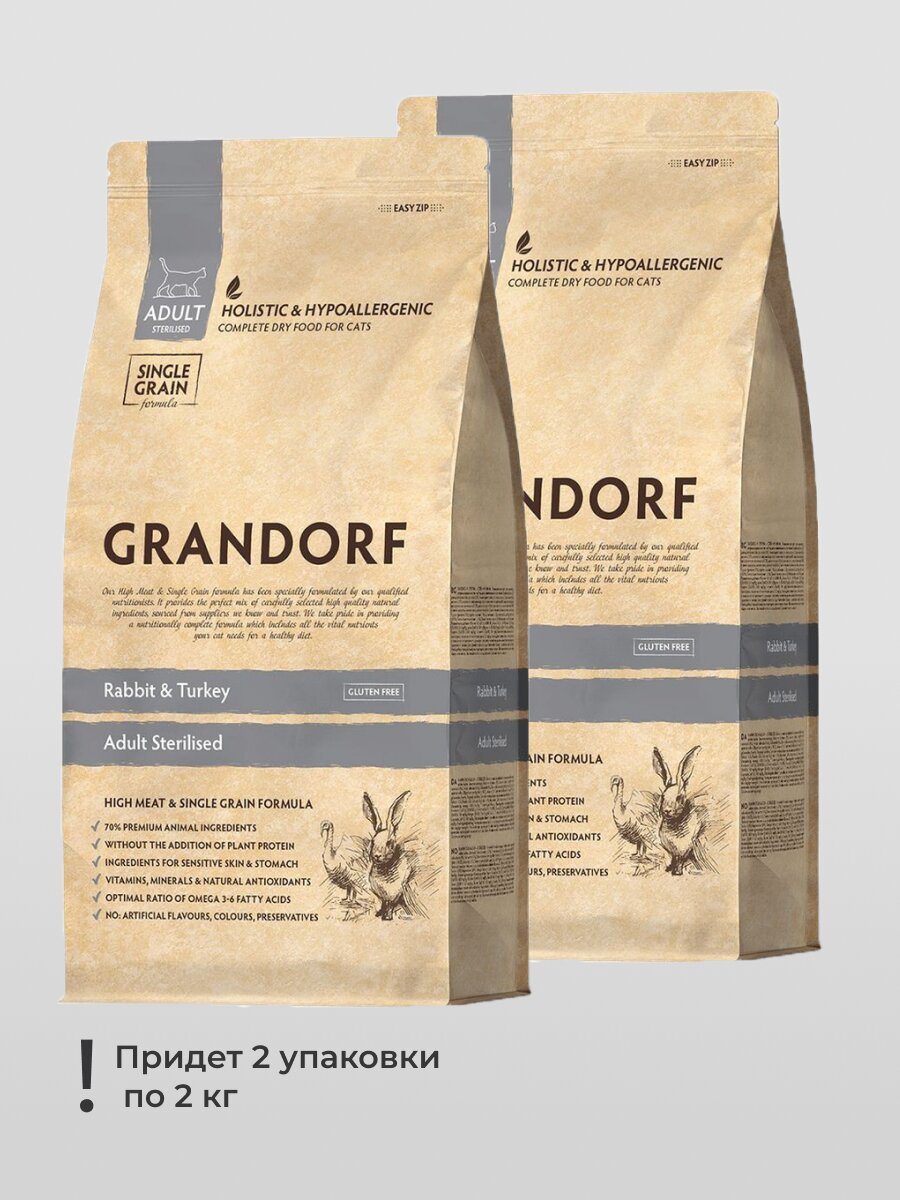 Купить Сухой корм Grandorf Cat Sterilised Rabbit & Turkey для стерилизованных кошек и котов Кролик и индейка, 2 кг х 2 шт. с доставкой по всей России.