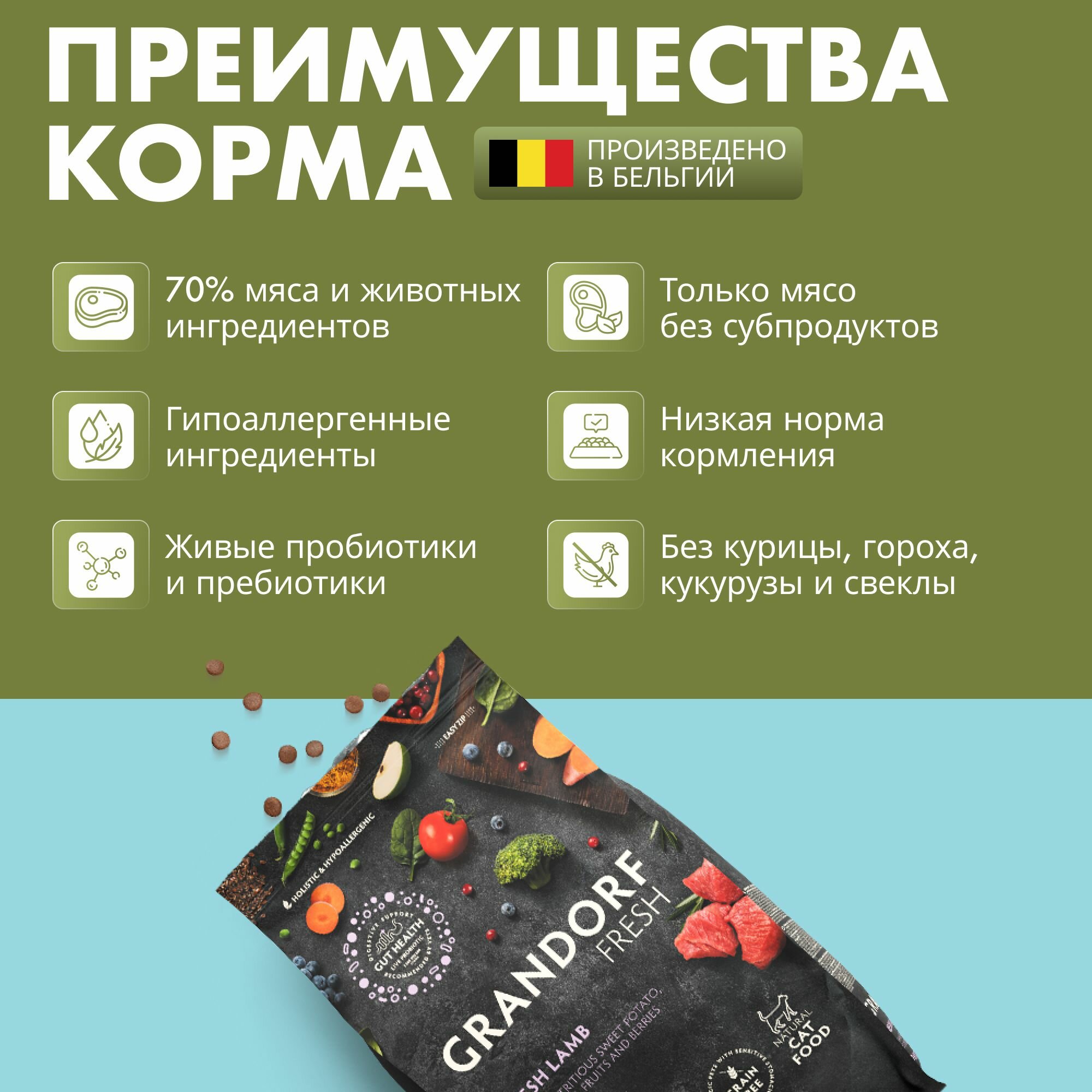 Благодаря беззерновому и безглютеновому составу корма Grandorf FRESH легко усваиваются и отлично подходят для животных с чувствительным пищеварением или пищевой аллергией.