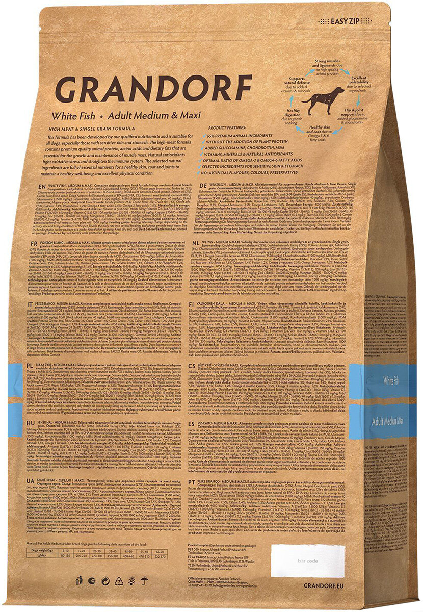 Дегидрированная треска (28 %), дегидрированная сельдь (27 %), цельнозерновой коричневый рис, жир индейки (5 %), порошок корней цикория (натуральный источник пребиотиков: ФОС и инулин), сушеный батат, сушеный шпинат, свежее масло лосося (3 %), мука из плодов рожкового дерева, сушеное яблоко, сушеный антарктический криль (натуральный источник ЭПК и ДГК кислот, 2 %), пивные дрожжи (природный источник МОС), глюкозамин (1500 мг/кг), хондроитин сульфат (1000 мг/кг), MSM (метилсульфонилметан, 40 мг/кг), сушеная клюква, Юкка Мохаве.