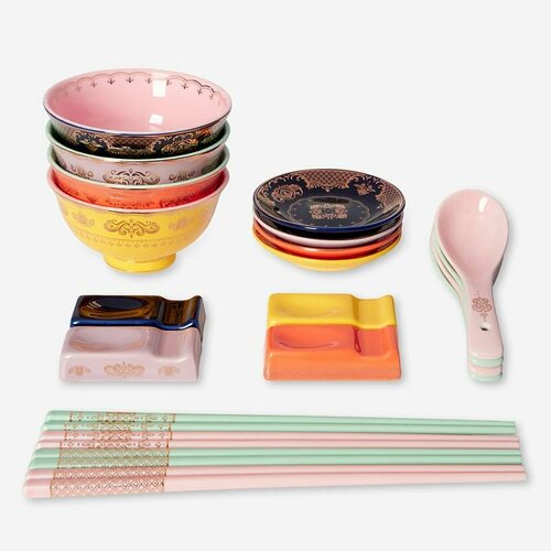 Набор для суши и мисо Grandpa от Pols Potten. В комплект входит посуда и приборы на четыре персоны: чаши для супа (например, мисо или рамена), ложки, блюдца для соуса, палочки и подставки под них. Оригинальная разноцветная посуда с позолоченным узором придаст азиатской еде новый колорит. Набор представлен в фирменной подарочной упаковке. Не подходит для мытья в посудомоечной машине и использования в микроволновой печи. Материалы: Фарфор Размер:4 x чаша для мисо — Ø 12 x H6,3 см; V 300 мл 4 x ложка — 14 x 4,5 x H3 см 4 x блюдце для соуса — Ø 10 x H1,5 см 4 x подставка под палочки — 8 x 3,5 x H1,8 см 4 x палочки (пара) — 24,3 x 0,6 x H0,6 см