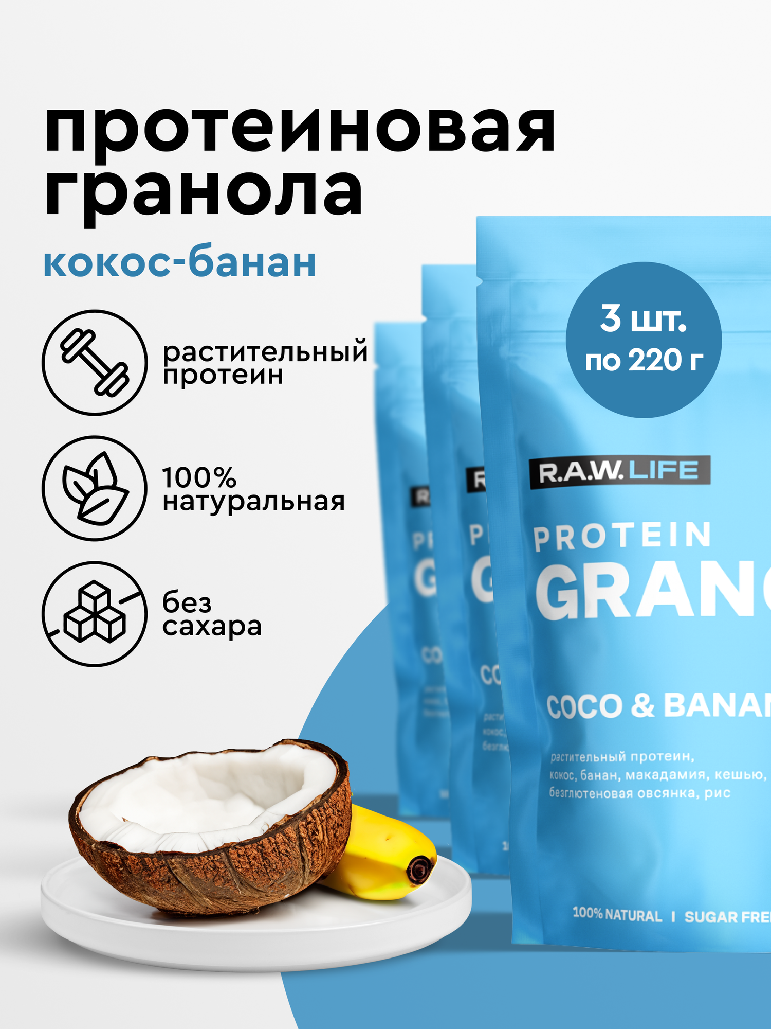Ищете идеальный завтрак, как в лучшем сне, который сочетает в себе пользу и отличный вкус? Протеиновая гранола R.A.W. LIFE без сахара и без глютена с цельными орехами, кокосом и бананом — ваш лучший выбор! Этот натуральный готовый веганский продукт идеально подходит для здорового питания и подарит вам заряд энергии на весь день.