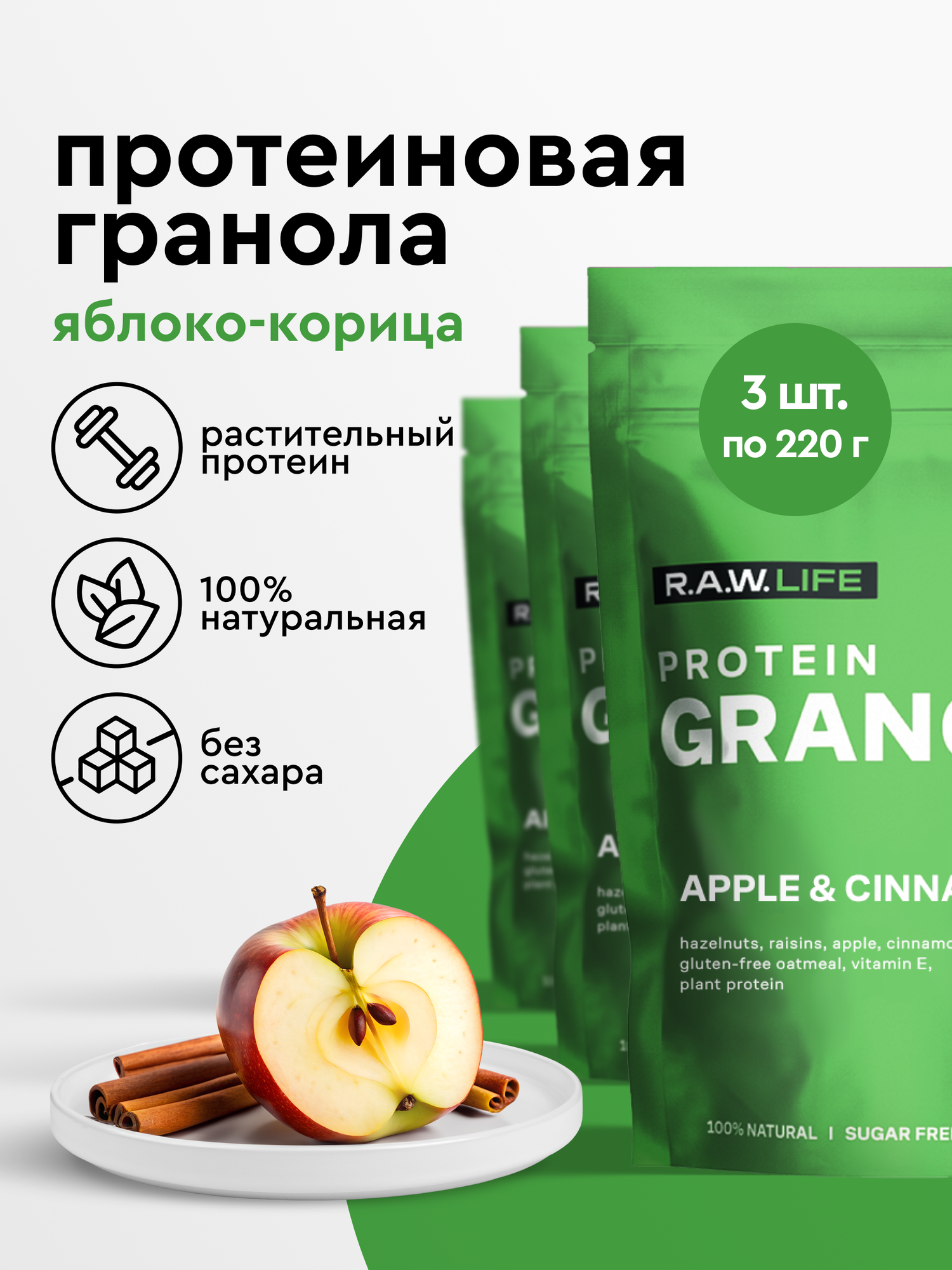 Наша гранола R. A. W. LIFE PROTEIN APPLE-CINNAMON - это волшебное сочетание, которое наполняет ваш завтрак уютом и теплом. Каждый кусочек этой гранолы словно обнимает вас в хмурое утро, вызывая приятные воспоминания о домашних пирогах с яблоками. Приготовленная с заботой, гранола станет не только вкусным, но и питательным завтраком, зарядив вас энергией на целый день.
