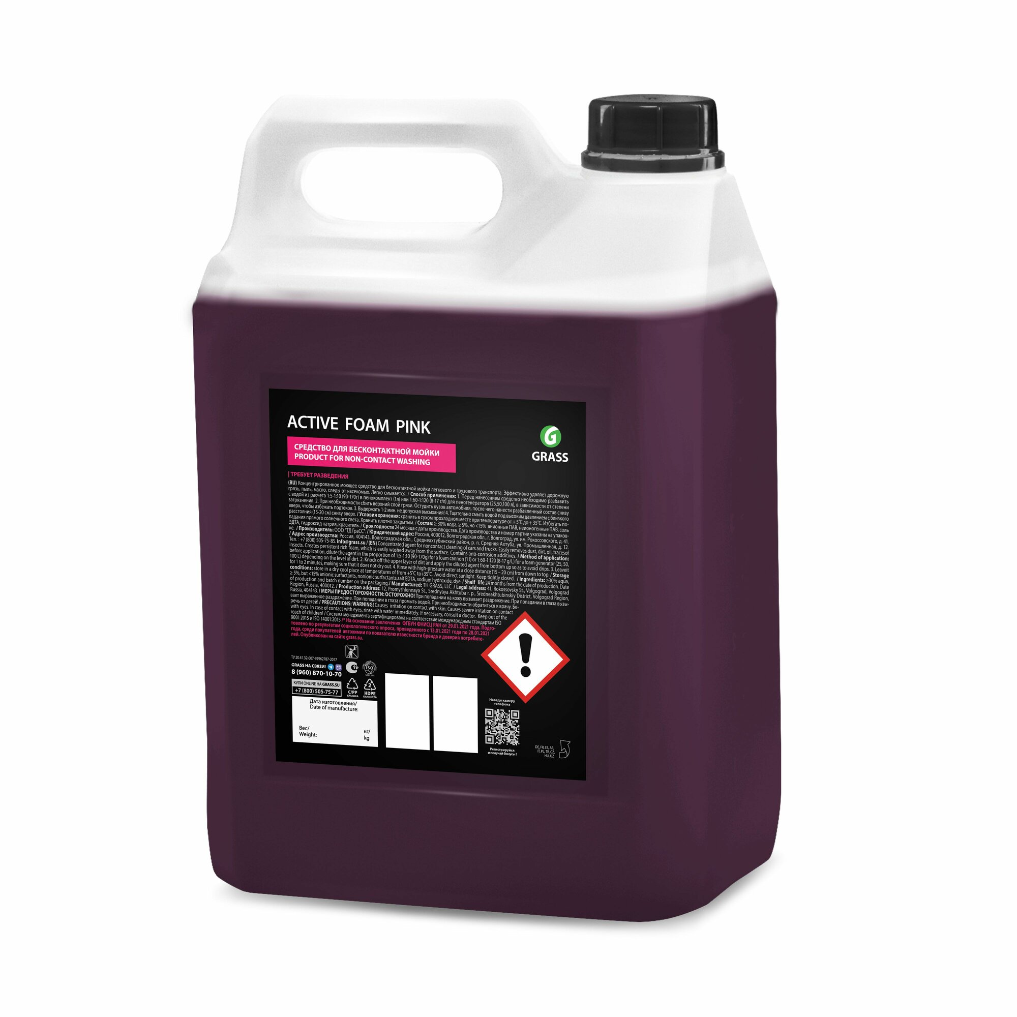 Цветной автошампунь Active Foam Pink, активная пена Grass для бесконтактной мойки автомобиля, профессиональная автохимия для ухода за авто, канистра 6 кг. Активная пена для бесконтактной мойки Грасс пинк, борется с грязью, следами от масла (антижир) и насекомых, подходит для очистки дисков, стекол, пластика и металла. Автохимия для автомобиля замедляет коррозию на кузове авто и предотвращает ржавчину. Автошампунь для бесконтактной мойки легковых машин, грузовиков, автотранспорта подходит, как для автомойки, так и для личного использования. Пена для автомобиля (бесконтактной мойки) - профессиональный товар для мытья автотранспорта, подходит для использования на мойках самообслуживания. Этот продукт подходит, как средство для мытья мототранспорта. Автошампунь для бесконтактной мойки 5 литров справится с загрязнениями после дождя и оставит блеск и сияние вашего автомобиля на долгий срок. Наша автохимия автокосметика для ухода за автомобилем Grass - прекрасный вариант на подарок. После мойки рекомендуется использовать воск, полироль и антидождь. Профессиональная химия для мойки не портит наклейки на автомобиле. Способ применения:1. Шампунь автомобильный разбавить с водой из расчета 90-170г в пенокомплект 1 л или 15 г/л для пеногенератора 25, 50, 100 л, в зависимости от степени загрязнения. 2. Нанести разбавленный состав, концентрат для мойки авто, снизу вверх, чтобы избежать подтеков. 3. Выдержать 1 - 2 минуты, не допуская высыхания. 4. Моющее средство для автомобилей тщательно смыть водой под высоким давлением с близкого расстояния 15-20 см снизу вверх. Продукт не является пеной для чистки салона автомобиля.