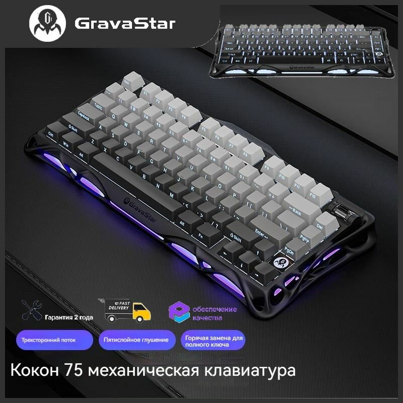 | Комплектация | Механическая клавиатура GravaStar GS K1 75*1 Опытный вал (по 1 желтому, фиолетовому, синему и белому)*4 Съемник клавиш*1 Кабель TYPE-C/USB*1 Инструкция по эксплуатации*1 |