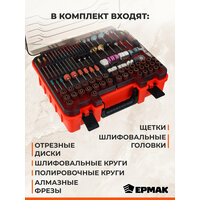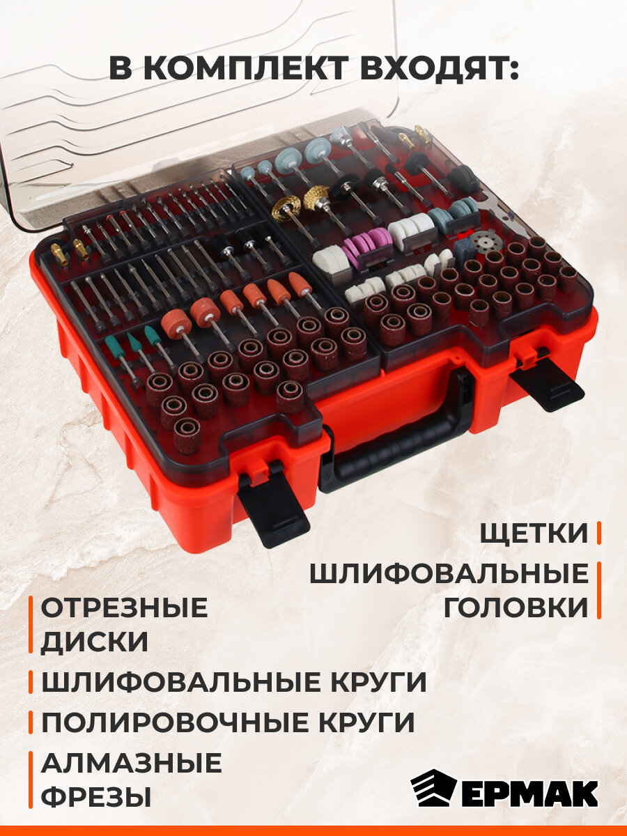 Отрезные диски из смолы, 32х1.2 мм — 6 шт. Отрезные диски — 30 шт. Шлифовальные круги — 110 шт. Маленький круг — 1 шт. Большой круг — 1 шт. Шлифовальные ленты — 17 шт. Гаечный ключ — 1 шт. Алмазный диск — 1 шт. Фетровые круги — 2 шт. Большие фетровые круги — 2 шт. Маленькие фетровые круги — 6 шт. Шлифовальные головки — 6 шт. Шлифовальные головки (из оксида алюминия) — 6 шт. Шлифовальные головки (алундовые) — 6 шт. Резиновые круги — 2 шт. Нейлоновые щетки — 3 шт. Стальные щетки — 2 шт. Цанги — 4 шт. Шарошка — 1 шт. Вакуумная присоска — 1 шт. Шлифовальные круги — 4 шт. Маленькие шлиф. ленты — 20 шт. Большие шлиф. ленты — 20 шт. Шлифовальные круги — 6 шт. Шарошки резиновые — 3 шт. Шлифовальные иглы — 3 шт. Алмазные фрезы — 10 шт. Резьбовые стержни — 9 шт. Держатели для алмаз. дисков — 2 шт. Гравировальный резак — 1 шт. Проволочные щетки — 2 шт. Держатель для фетрового круга — 1 шт.