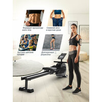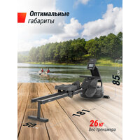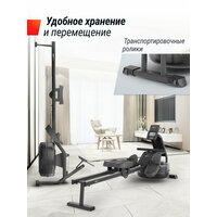Тренажер построен на прочном каркасе из стали и способен выдержать вес пользователя до 130 кг. Данная конструкция гарантирует стабильность и безопасность во время самых интенсивных тренировок. Благодаря водному сопротивлению создается ощущение настоящей гребли по воде, а увеличивая объем воды в цилиндре можно индивидуально подбирать нагрузку, выбирая из 6 уровней сложности. Прозрачный бак на 10 литров выполнен из пластика, что дает возможность видеть уровень воды, а также создает приятное визуальное ощущение во время занятий, успокаивая нервную систему.