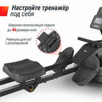 Тренажер построен на прочном каркасе из стали и способен выдержать вес пользователя до 130 кг. Данная конструкция гарантирует стабильность и безопасность во время самых интенсивных тренировок. Благодаря водному сопротивлению создается ощущение настоящей гребли по воде, а увеличивая объем воды в цилиндре можно индивидуально подбирать нагрузку, выбирая из 6 уровней сложности. Прозрачный бак на 10 литров выполнен из пластика, что дает возможность видеть уровень воды, а также создает приятное визуальное ощущение во время занятий, успокаивая нервную систему.