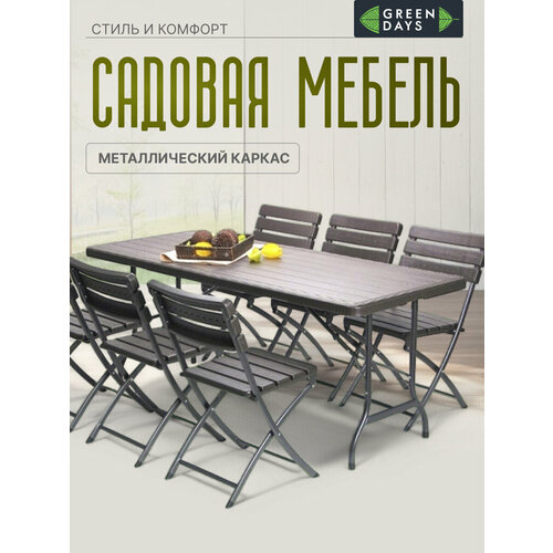 Создайте уютную атмосферу с изысканным комплектом садовой мебели от бренда Green Days серии "Большая семья". Садовая мебель создана, чтобы преобразить ваш участок, это идеальный выбор для дачи и сада. Набор пластиковой мебели для 6 персон включает в себя всё необходимое для комфортного отдыха на природе. Товары для сада и дачи Грин Дейс из пластика и металла отличаются легкостью и прочностью, что делает их универсальными. Комплект мебели позволяет организовать стильное пространство не только дома, но и создать впечатляющее место отдыха возле гриля или барбекю. Стул складной из пластика создан в современном стиле с каркасом из металла удобной формы. Эти стулья идеально подходят как для отдыха у бассейна дома, так и на веранде. Высокая спинка обеспечивает дополнительный комфорт во время длительных посиделок. Добиться уютной атмосферы поможет большой пластиковый стол. Обеденный складной стол отлично подходит для чаепития или пикника на свежем воздухе благодаря надежной столешнице прямоугольной формы из пластика и ножкам из металла. Габариты комплекта и максимальная нагрузка: Размер стола (ШхГхВ): 180х75х74 см; нагрузка 40 кг; Размер стула (ВхШхГ): 82х46х56 см; нагрузка 100 кг. Каркас мебели бренда Грин Дейс изготовлен из прочного металла, способного выдерживать высокие весовые и другие механические нагрузки без риска деформации и расшатывания. Набор садовой мебели устойчив к погодным условиям и легко очищается от загрязнений.