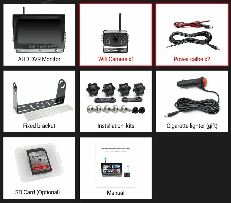 GreenYi 9-дюймовый цифровой беспроводной резервный 4-канальный комплект AHD-монитора с записывающей камерой DVR для грузовиков/приводов/автобусов, with 1 camera
