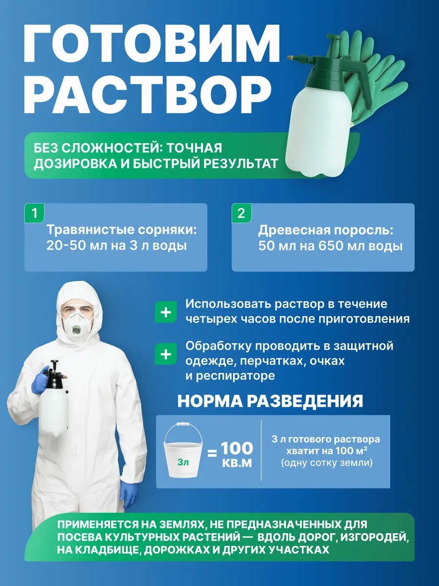 : в течение первых суток после обработки прекращается рост и развитие растений. Видимые признаки повреждений проявляются через 7-14 дней в виде обесцвечивания и побурения точек роста. Полная гибель травянистой растительности наступает через 1-2 месяца, древесно-кустарниковой – через 2-3 месяца.