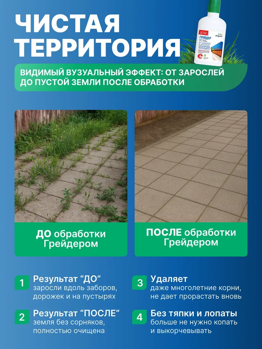 Грейдер ВГР (250 г/л имазапира) - почвенный гербицид сплошного действия для очистки от сорняков и древесно-кустарниковой растительности участков, непредназначенных под посадку и посев растений. Преимущества препарата: Полное уничтожение всех видов сорняков даже самых злостных и нежелательной древесно-кустарниковой растительности. Защищает на срок до 3 лет. Действует на надземную часть сорняков и их корневую систему. Устойчив к смыванию дождём уже через час после обработки. Скорость воздействия: Первые признаки действия препарата наблюдаются через 7 – 14 дней после обработки. Полная гибель травянистой растительности наступает через 1 – 2 месяца, древесно-кустарниковой – через 2 – 3 месяца после применения. Период защитного действия: Препарат обеспечивает необходимый эффект в течение не менее одного года с момента обработки. Общая длительность действия зависит от нормы расхода, количества сорняков, их видового состава, типа почвы, климатических условий. При использовании в сельском хозяйстве препарат защищает посевы от сорняков в течение всего вегетационного периода.