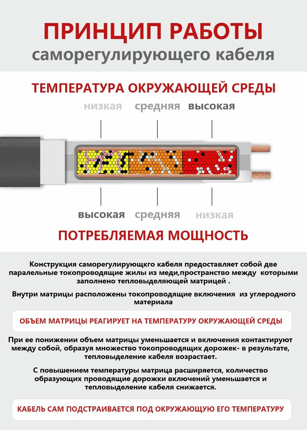 Кабельная секция СТН НСК представляет собой саморегулирующийся кабель, соединенный с силовым шнуром и вилкой. Токопроводящую основу образуют две металлические жилы, расположенные параллельно друг другу. По ним, при эксплуатации, течет переменный ток напряжением 220 В. Жилы кабеля соединены матрицей с частицами графита. Матрица регулирует уровень отдачи тепла в зависимости от температуры окружающей среды и обогреваемой поверхности. Если температура снижается, кабель начинает интенсивно выделять тепло, не позволяя обогреваемой поверхности промерзать. При повышении температуры выделение тепла, соответственно, сокращается и тратится меньше электроэнергии.