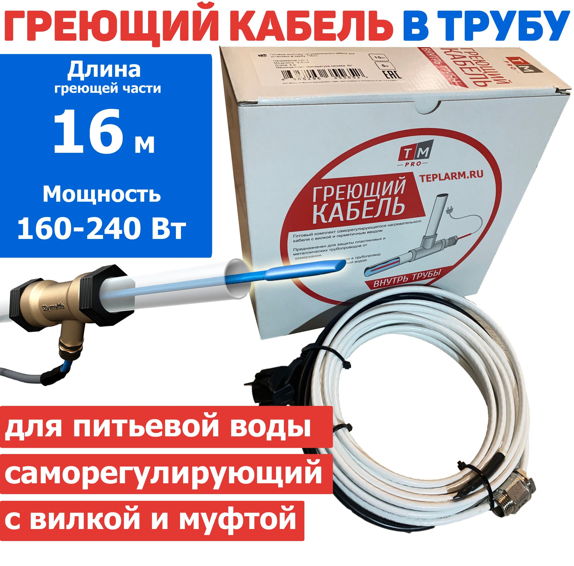 Купить Греющий кабель в трубу 16 м 160 Вт с сальником и вилкой саморегулирующий готовый комплект с доставкой по всей России.