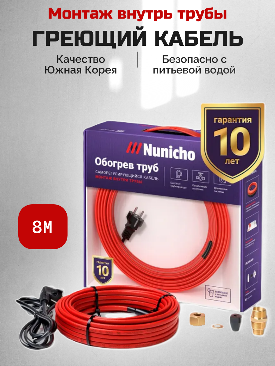 Саморегулирующийся кабель в трубу Nunicho 10 Вт/м, 8 м, с конусным сальником 1/2
