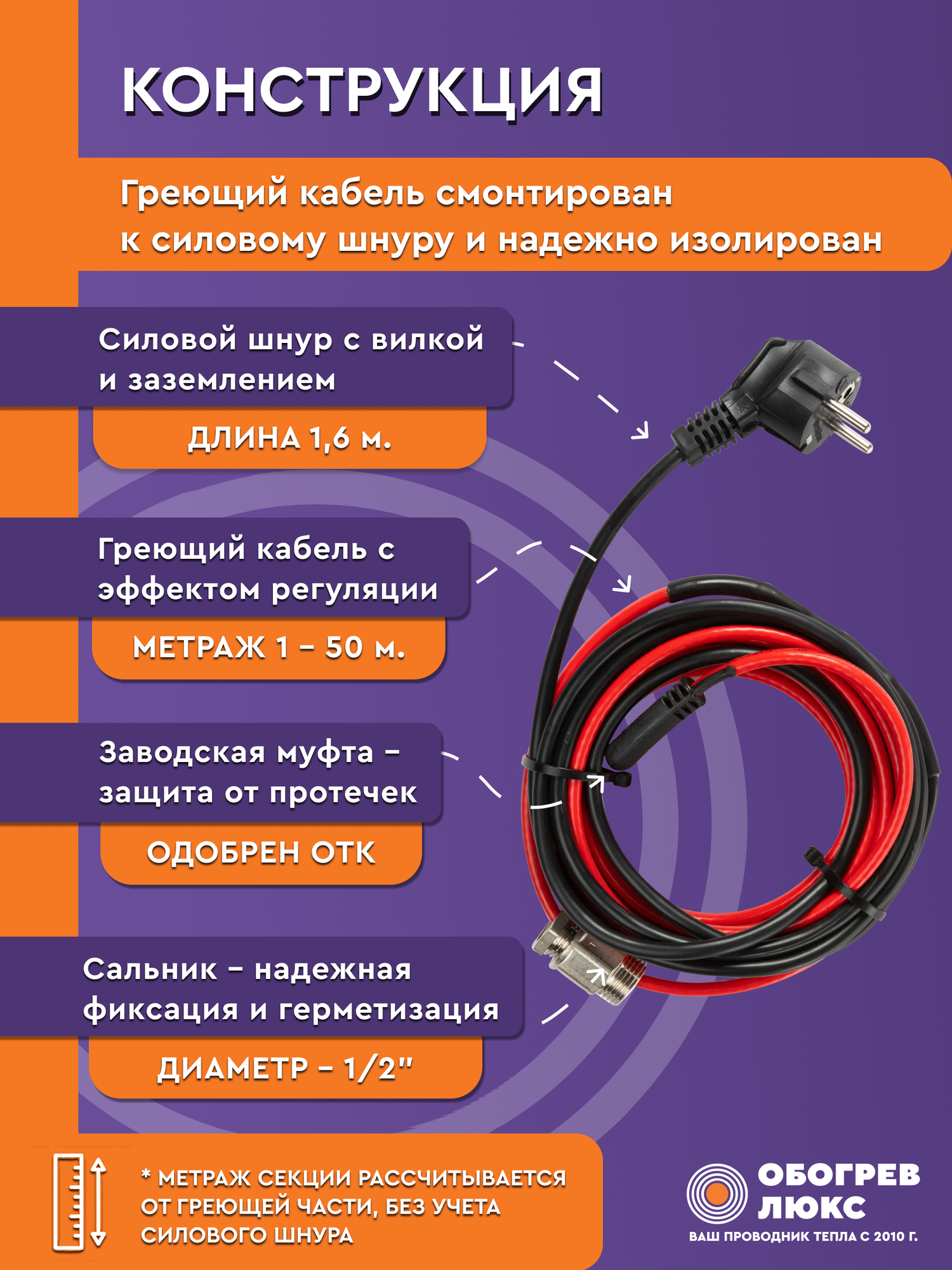 Купить Греющий кабель в трубу с сальником 1 м 11 Вт/м самрег для питьевого водопровода готовый комплект ТМ Обогрев Люкс с доставкой по всей России.