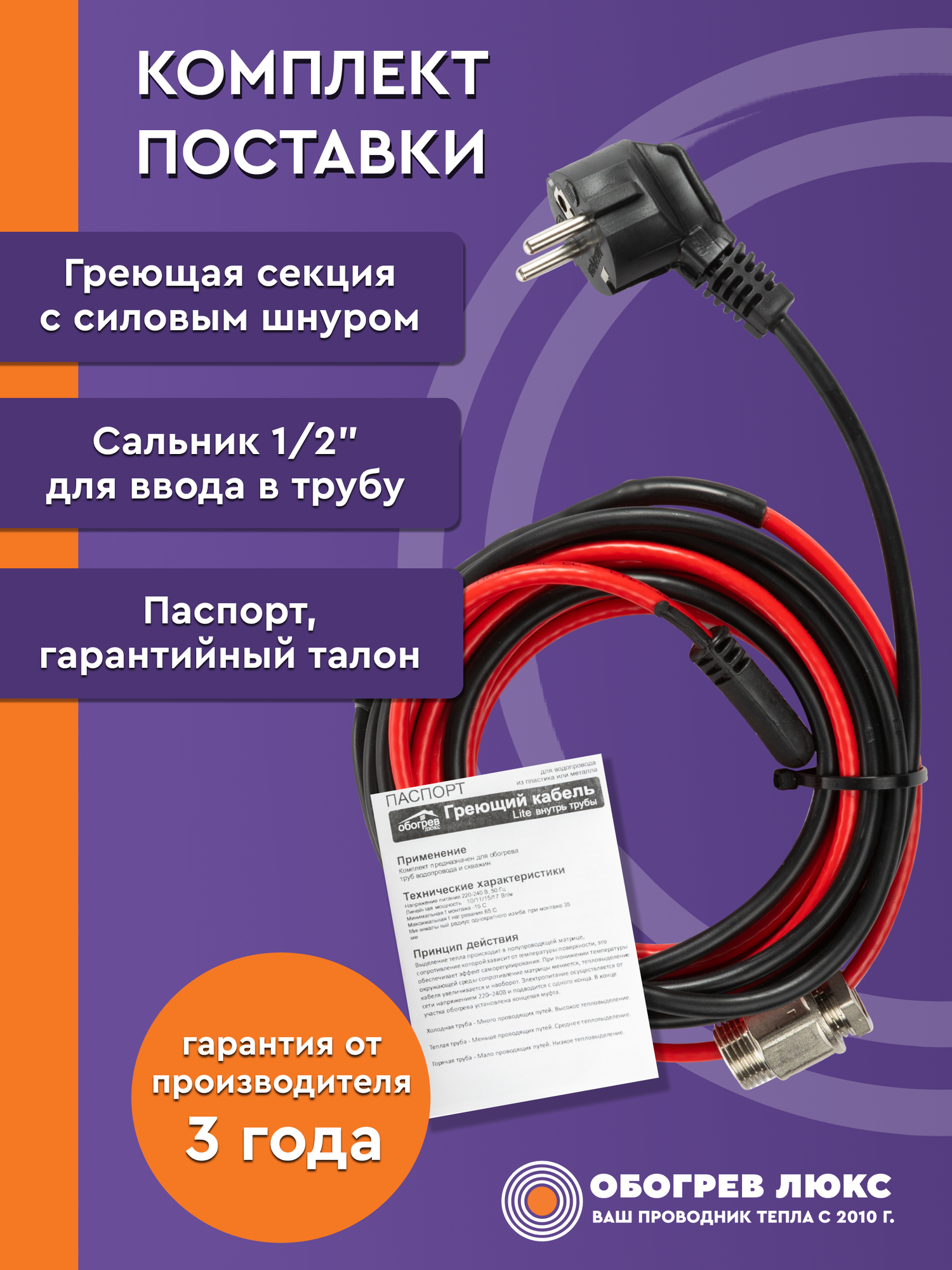 | Подробная комплектация | Греющий кабель с силовым шнуром, паспорт изделия, гарантийный талон |