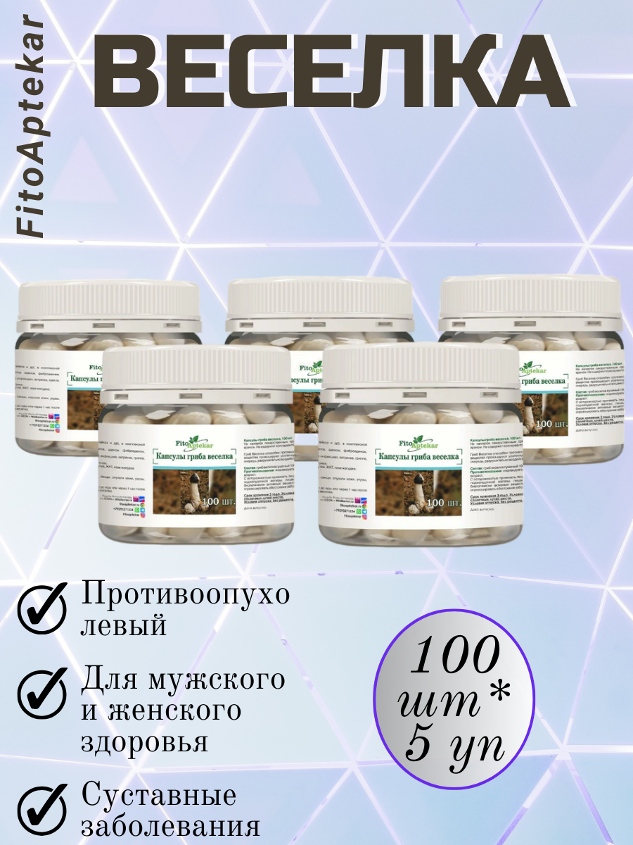 Купить Гриб веселка в капсулах Фито-Аптекарь, для мужского и женского здоровья, 100 шт*5 упаковки с доставкой по всей России.