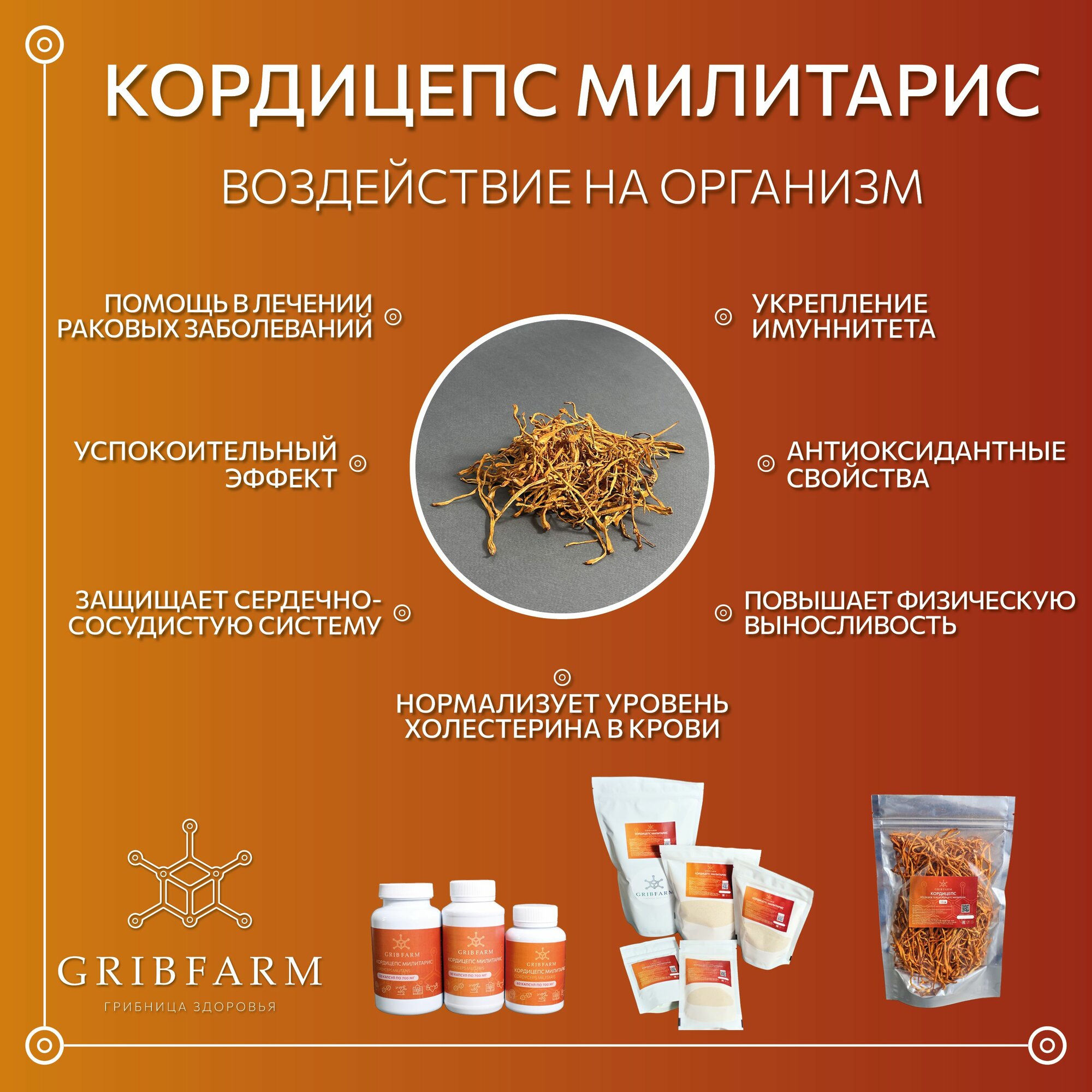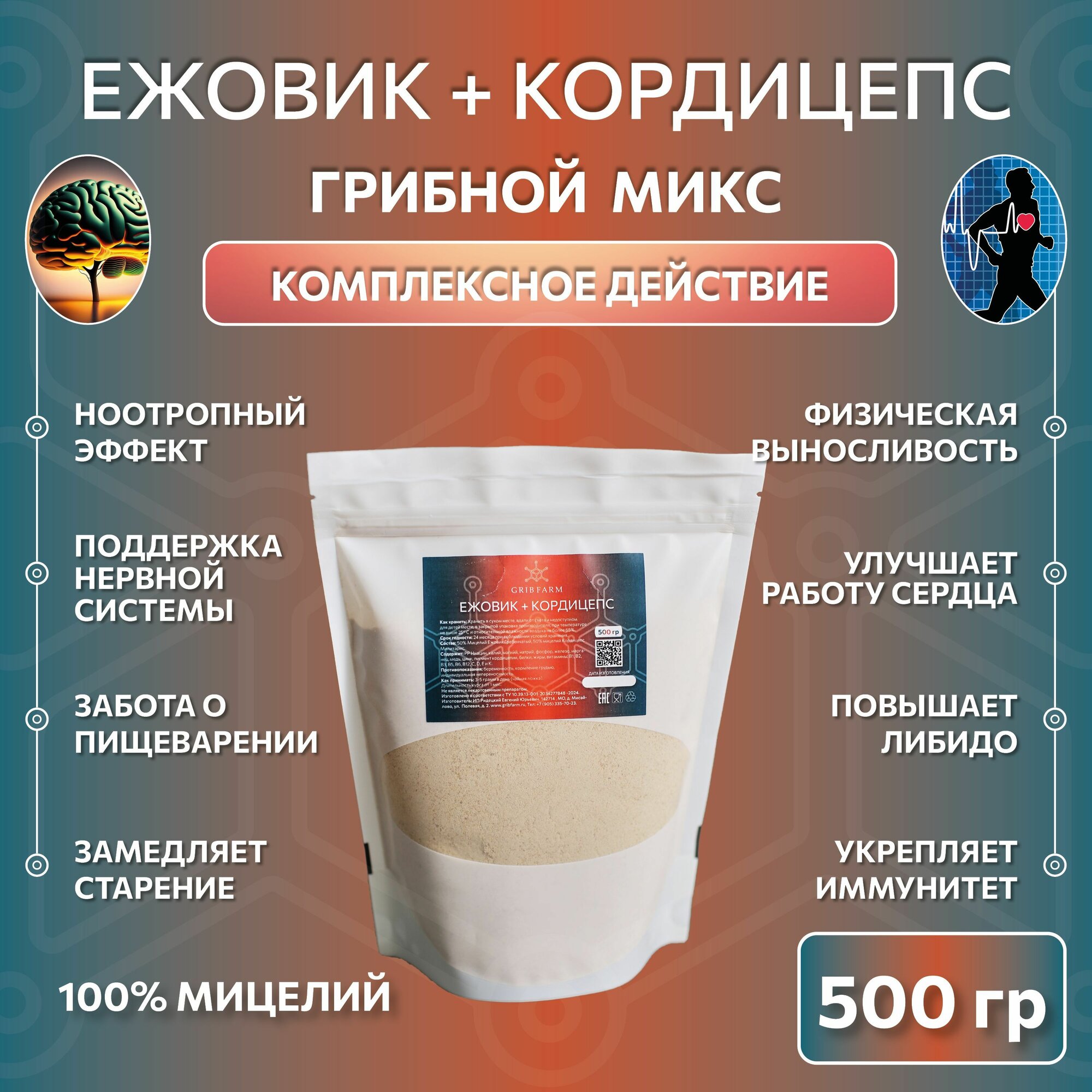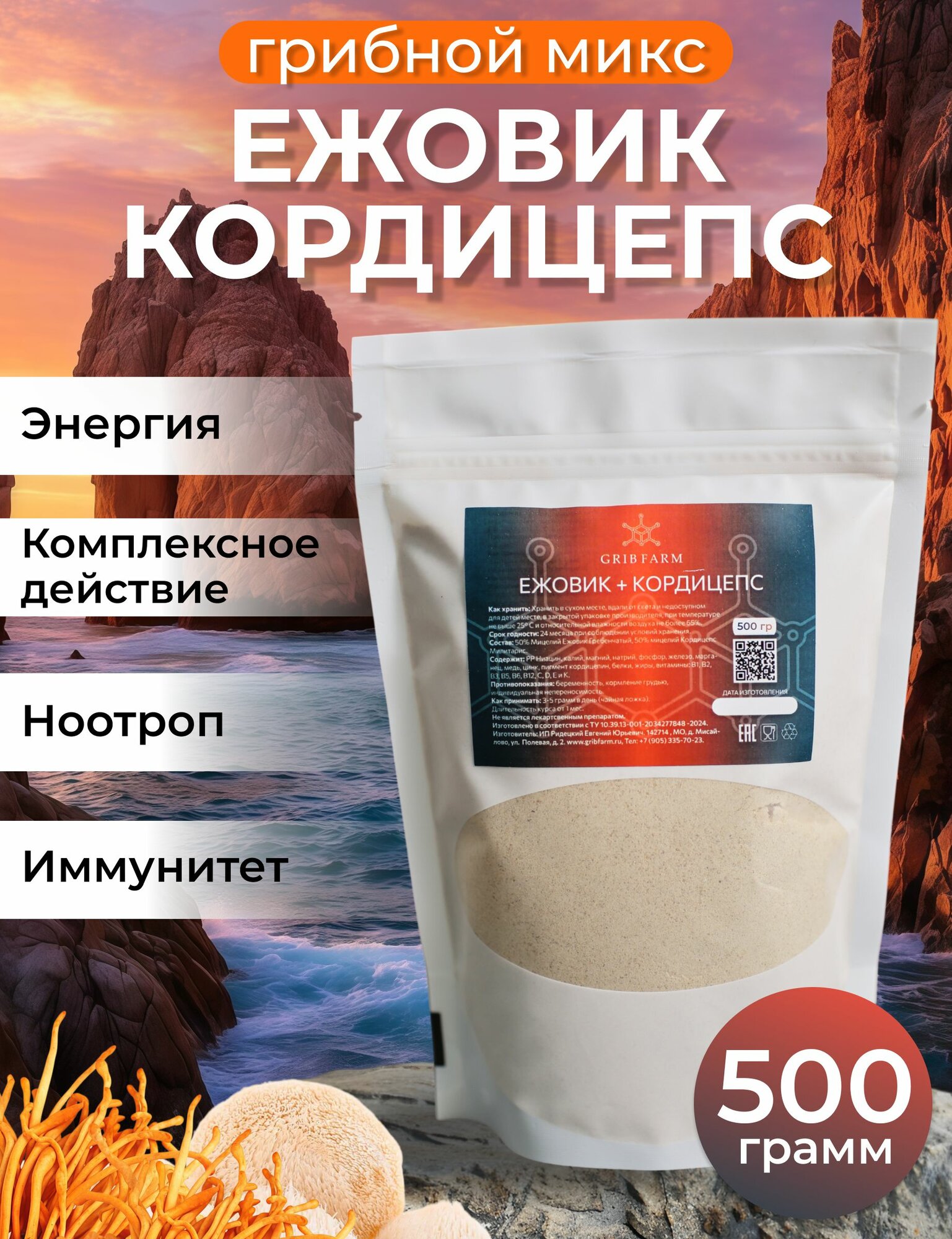 Представляем вам уникальный супер-микс, который сочетает в себе мощные свойства двух удивительных грибов: Ежовика Гребенчатого и Кордицепса Милитариса. Этот продукт станет вашим надежным помощником на пути к здоровью и активной жизни. Улучшение работы мозга и повышение концентрации. Увеличение физической выносливости и энергии. ежовик гребенчатый - Поддержка нервной системы: Ежовик известен как природный антидепрессант, который способствует росту нервных клеток и улучшает когнитивные функции, такие как память и внимание. - Укрепление иммунитета: Гриб усиливает активность Т- и В-лимфоцитов, что помогает организму бороться с инфекциями и снижать риск развития раковых клеток. - Забота о пищеварении: Он помогает при лечении гастрита и язв, улучшая работу желудочно-кишечного тракта. кордицепс милитрис - Энергия и выносливость: Кордицепс увеличивает уровень энергии, что делает его идеальным для активных людей и спортсменов. - Улучшение обмена веществ: Этот гриб способствует нормализации обмена веществ и снижению уровня стресса, что помогает поддерживать здоровье на высоком уровне68. - Иммуномодуляция: Кордицепс также укрепляет иммунную систему, защищая организм от различных заболеваний. Почему стоит выбрать наш супер-микс? Сочетание этих двух грибов в одном продукте обеспечивает комплексное воздействие на организм. Вы получите: Преимущества супер-микса от GRIBFARM: 1. Поддержка иммунной системы Ежовик гребенчатый способствует увеличению активности Т- и В-лимфоцитов, что усиливает иммунный ответ организма и помогает в борьбе с инфекциями. Кордицепс милитарис содержит полисахариды, которые активируют естественные клетки-киллеры и улучшают выработку цитокинов, способствуя общему укреплению иммунной системы2. 2. Улучшение когнитивных функций Ежовик известен как сильный ноотроп, который стимулирует рост нервных клеток и улучшает память и концентрацию. Это делает его идеальным для людей, стремящихся повысить свою продуктивность и умственные способности. Не упустите возможность улучшить качество своей жизни с помощью нашего супер-микса из Ежовика гребенчатого и Кордицепса милитариса!