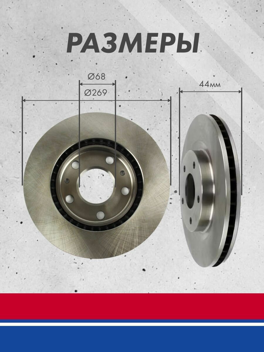 Параметры диска: Диаметр диска составляет 269 мм, толщина – 22,5 мм, минимальная допустимая толщина – 19,8 мм, высота – 44,1 мм, диаметр центрирования – 68 мм, разболтовка – 5x114,3 мм.