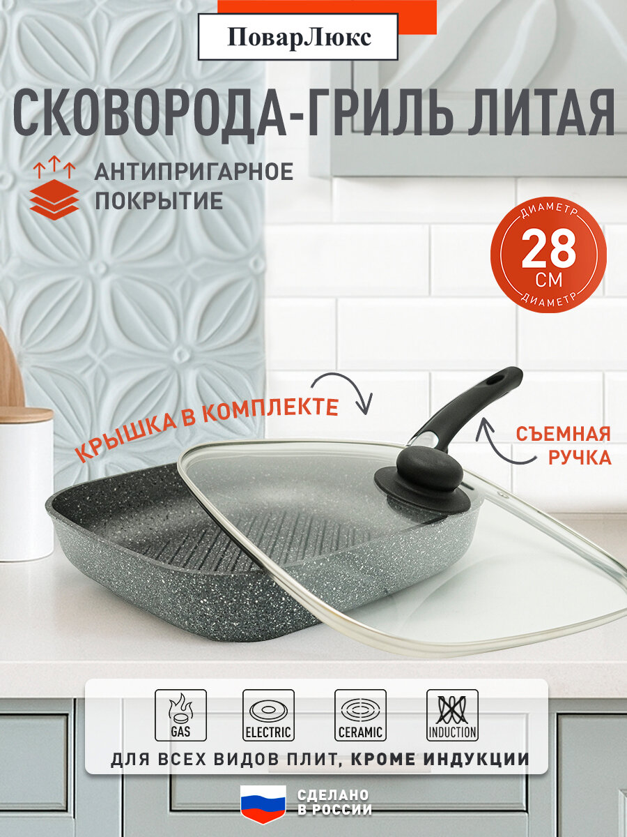 Гриль 28х28см квадратный, съемная ручка и крышка: сравнение цен, характеристики, фото, актуальное наличие и цены.
