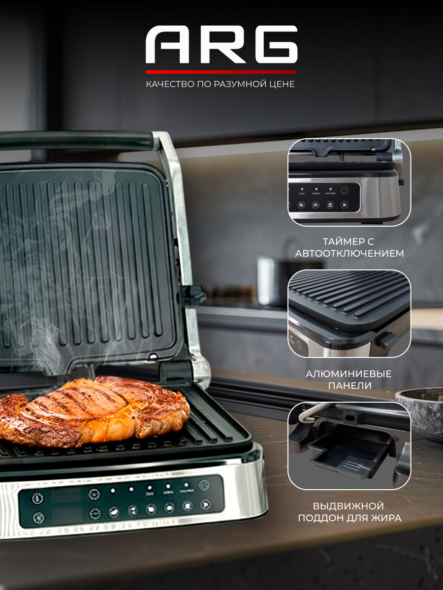 Купить Гриль ARG GR-196, 2000 Вт, 14 режимов, регулировка температуры, 2 съемные панели, серебристый с доставкой по всей России.
