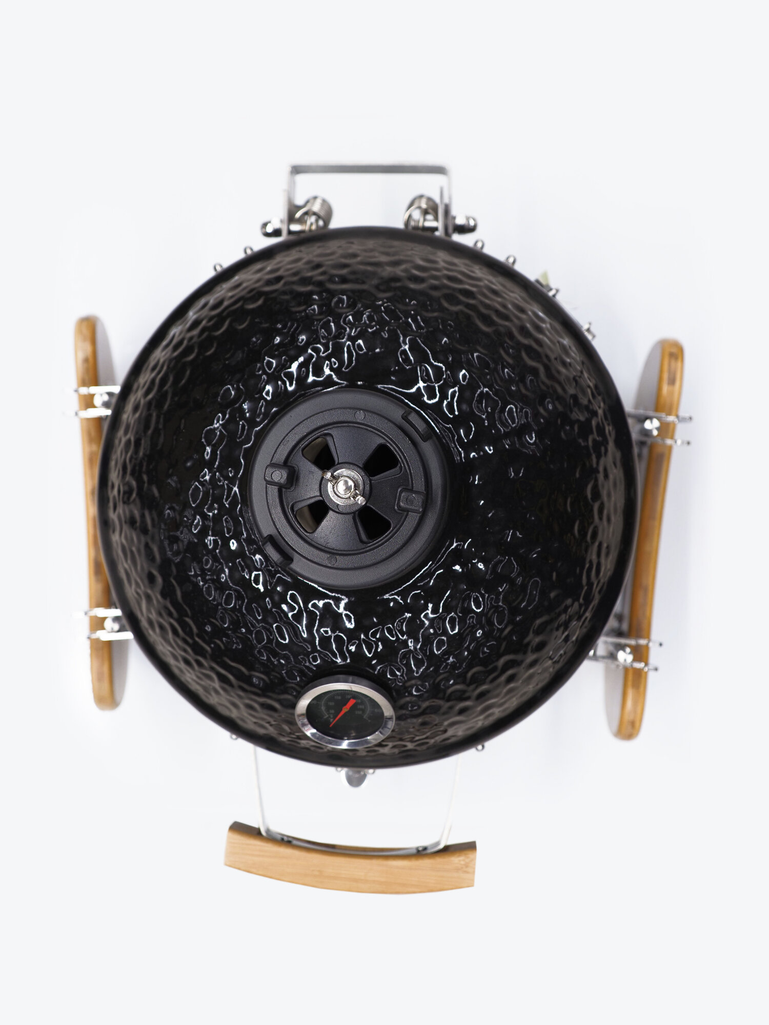 Циркуляция воздуха в керамическом гриле, происходит снизу вверх, равномерно прогревая весь корпус. Воздух активно теряет кислород, проходя через раскаленные угли, соответственно процесс обугливания продукта или «окисления» из-за кислорода, сводится к минимуму.