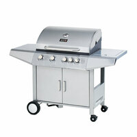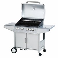 Характеристики: • Материал: сталь с эмалевым покрытием • 4 основных + 1 боковая горелки • Диаметр решетки для приготовления: 18х39 см х 4 шт. • Материал решетки: перфорированная сталь с эмалевой поверхностью • Мощность: 12,6 кВт + 3,15 кВт • Давление газа: 28-30/37 мбар • Максимальный расход газа: 228 г/ч • Топливо: сжиженный пропан-бутан • Тип розжига: электрический • Максимальная температура: 330°С • Термометр • Колеса: 4 шт. • Жиросборник • Регулятор и шланг 1 м в комплекте • Размер: 138,8х58,1х109,9 см • Высота до жаровни: 85 см • Вес нетто: 33 кг