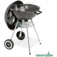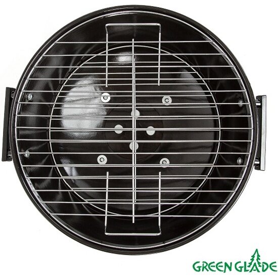 Жаровня уличного гриля-барбекю Green Glade выполнена из углеродистой стали 0,4 мм и покрыта жаростойкой эмалью черного цвета, работает на углях. Накрывается крышкой. На крышке и жаровне есть ручки из жаропрочного пластика (бакелит), которые не нагреваются в процессе приготовления пищи. Жаровня гриля располагается на оптимальной высоте на ножках, на двух из которых есть колеса, облегчающие его перемещение. Диаметр хромированной решетки для приготовления пищи 41 см. Также у уличного гриля есть регулировка подачи воздуха и нижняя полка для мешка с углем.