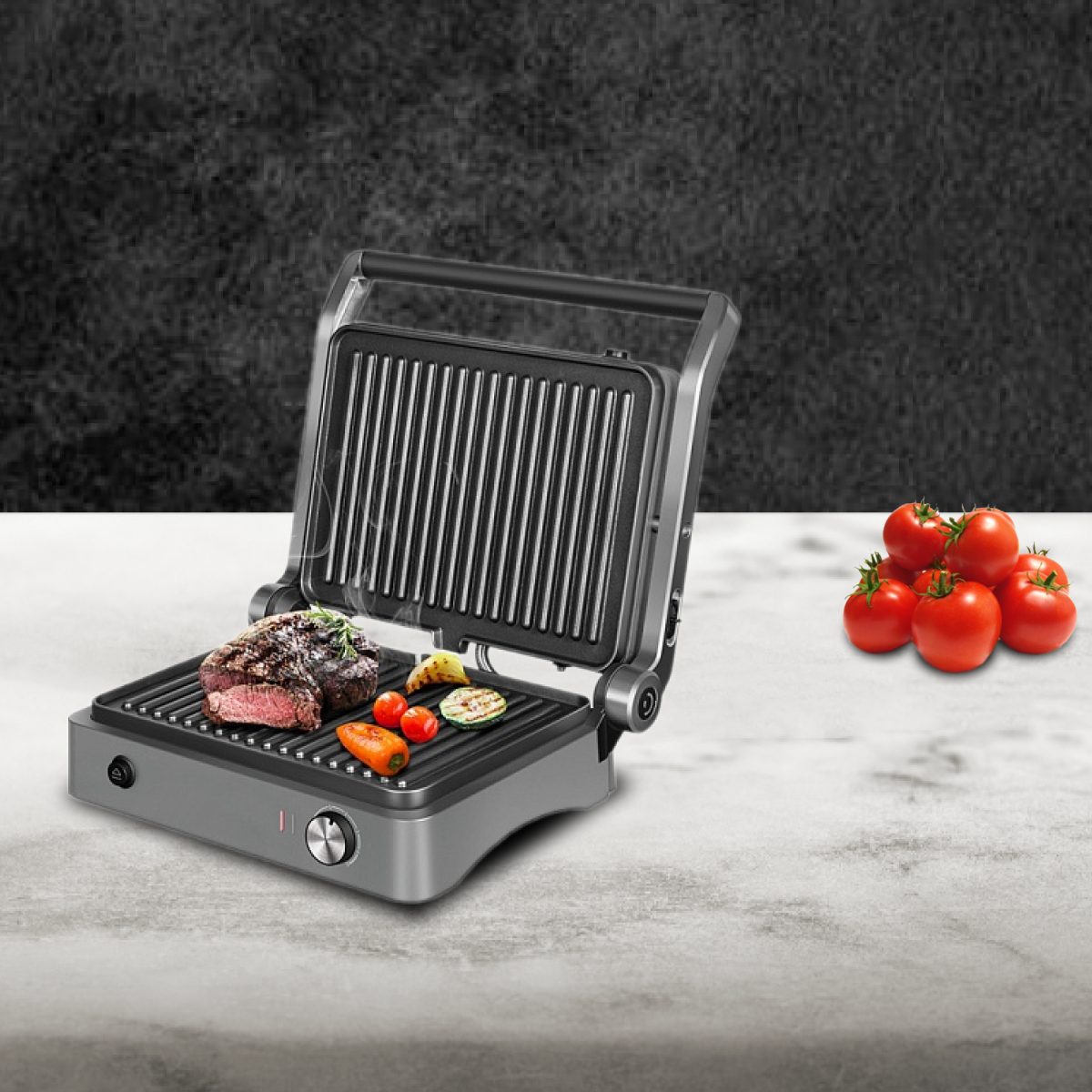 Особенности гриля включают контактные пластины, поддон для сбора жира и антипригарное покрытие рабочей поверхности.
