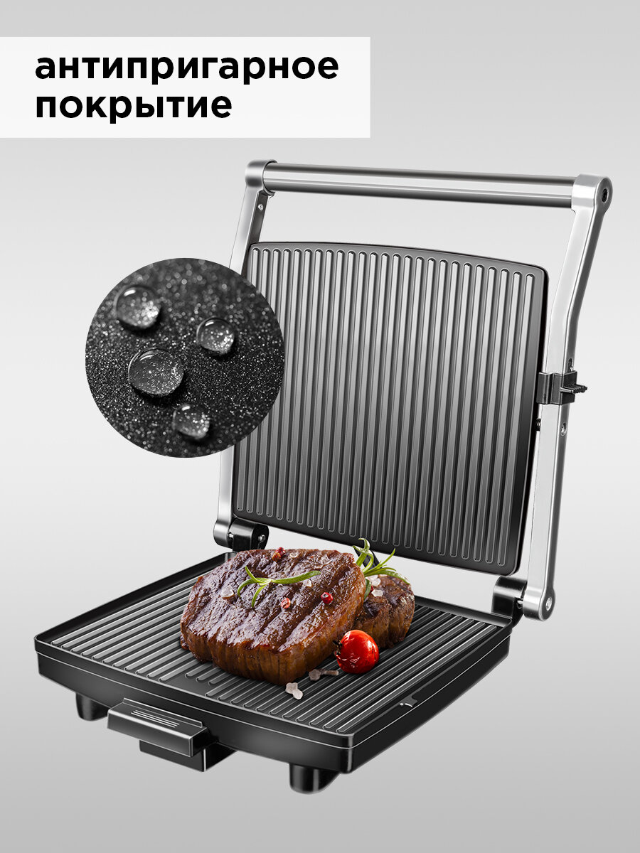 антипригарное покрытие, контактный гриль, крышка, поддон для сбора жира, регулировка высоты верхней панели, решетка, съемные пластины