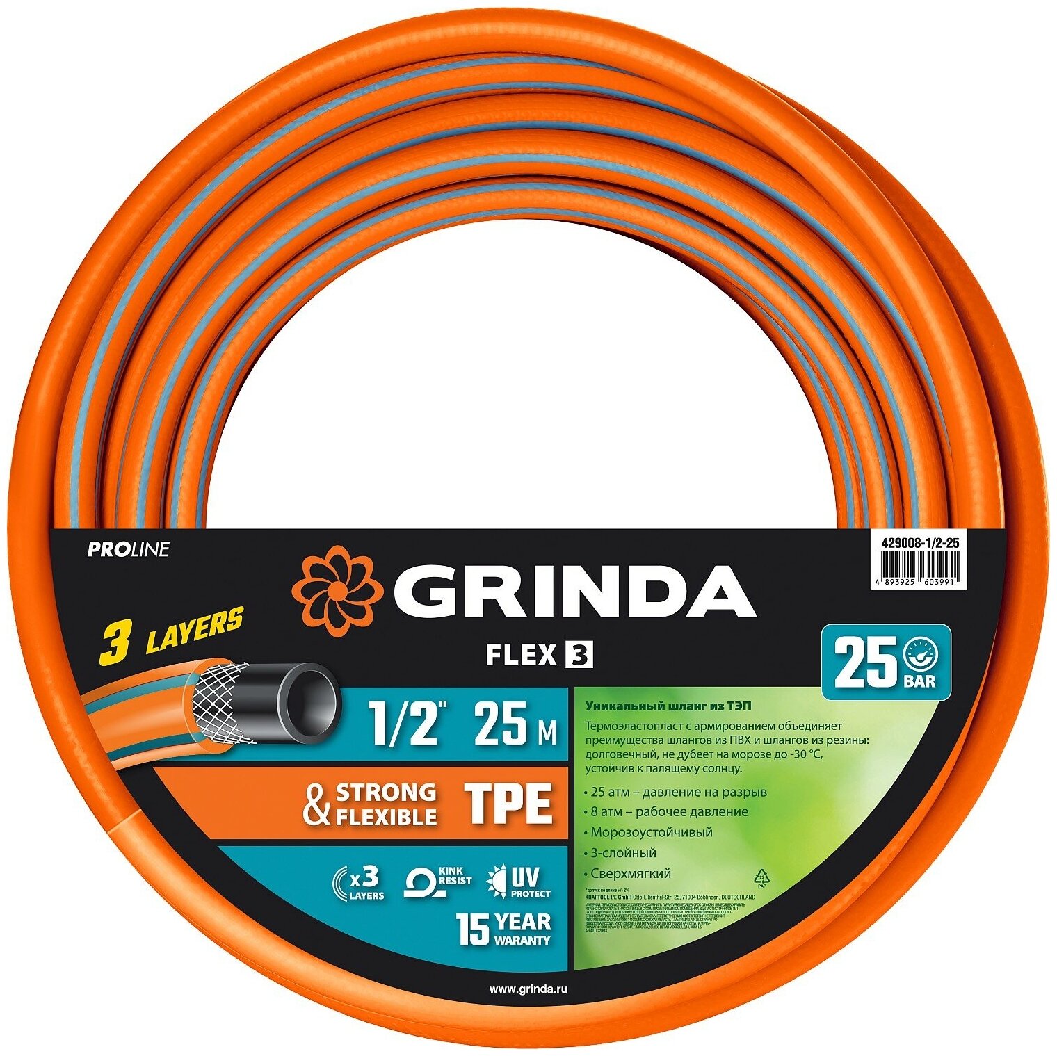 Шланг для полива армированный GRINDA 429008-1-25, используется на садово-огородных участках при проведении поливочных или иных работ, требующих водоснабжения. Легкий, прочный и эластичный 3х слойный шланг с сетчатым армированием.
