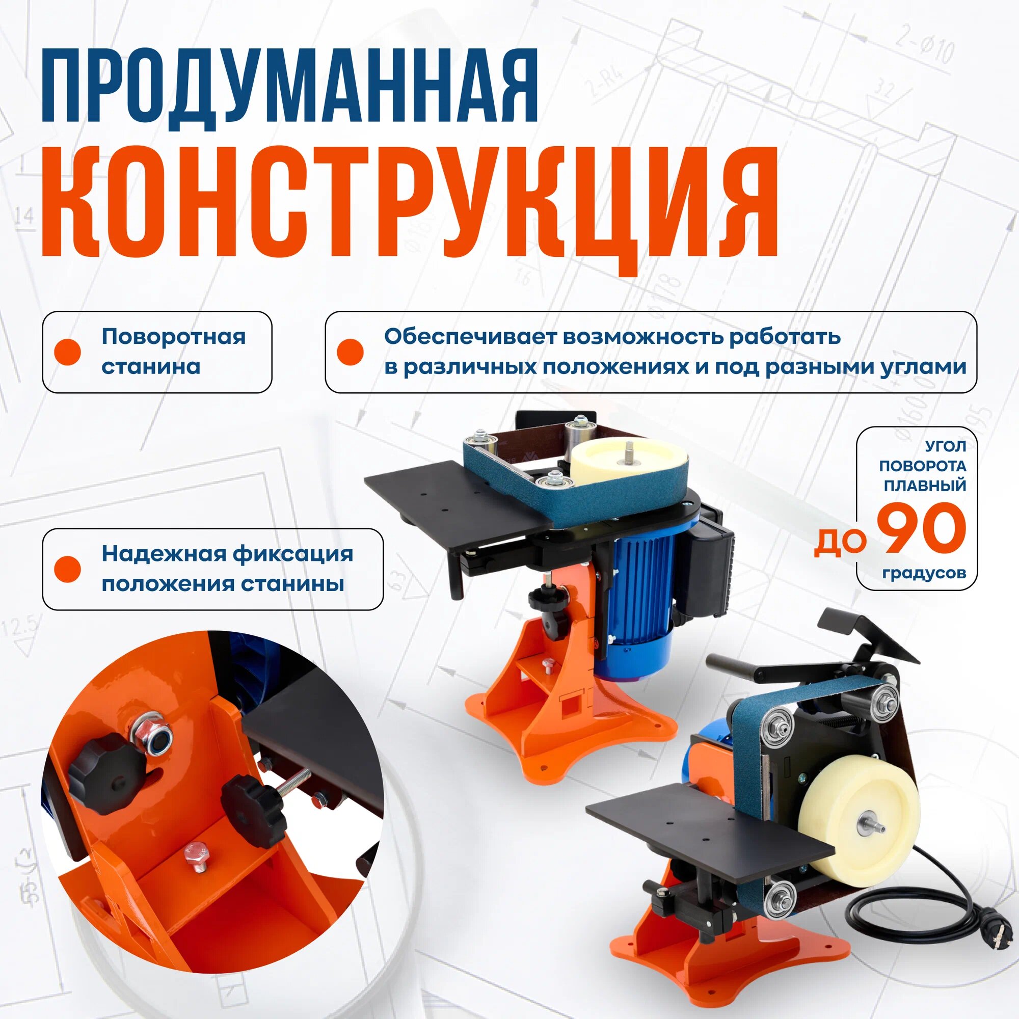 *Работайте в горизонтальном и вертикальном положении станка. Поворотная станина позволяет развернуть рабочую область на 90 градусов. Так удобнее обрабатывать лезвия и широкие детали.