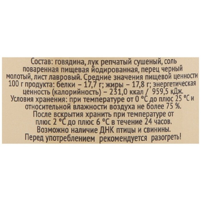 Нежное, сочное мясо на основе говяжьего филе, с добавлением лука и специй (соль, перец, лавровый лист). Натуральное мясо в собственном соку.