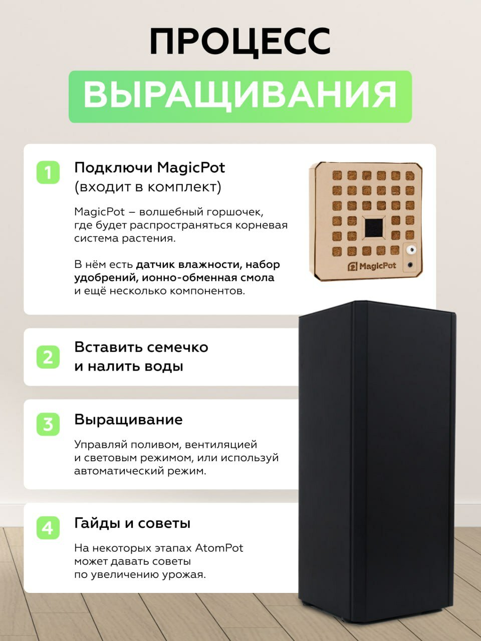 Нужно подключить Magicpot (входит в комплект), вставить в него семечко (сувенир) и налить воды. Установить фильтр. Следующие два месяца Atompot сам будет следить за поливом, светом, вентиляцией и температурой. На некоторых этапах Atompot может давать советы по увеличению урожая.