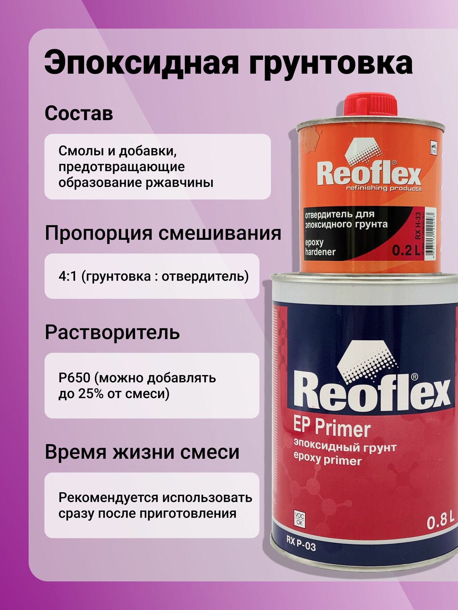 REOFLEX грунтовка эпоксидная содержит смолы и добавки недопускающие образование ржавчины, обеспечивает хорошую адгезию лакокрасочных материалов с открытым металлом и его защиту от влаги. Эпоксидная грунтовка REOFLEX предназначена как для ремонта как легковых, так и грузовых автомобилей и прицепов. Также эпоксидная грунтовка необходима при восстановлении лакокрасочного покрытия плавсредств и изделий из металлов подверженных непосредственному контакту с водной средой. Эпоксидная грунтовка REOFLEX имеет хорошую адгезию к различным поверхностям ( металлы, дерево, пластик, стекло, бетон и т. д.) а также обладает отличными изоляционными свойствами. Эпоксидная грунтовка также способна быть изолирующим слоем для несовместимых лакокрасочных материалов, исключая растворение одних материалов другими. Эпоксидная грунтовка REOFLEX соединяется в пропорции 4:1 с отвердителем. Растворитель Р650 можно добавлять в полученную смесь до 25%. В разных документах обозначают разное время жизни грунта после соединения с отвердителем. Мы рекомендуем применять смесь сразу, после её приготовления. Заливать грунт в краскопульт только через фильтр-воронку. Рекомендуем простой, недорогой и надёжный краскопульт для нанесения первичных грунтов.