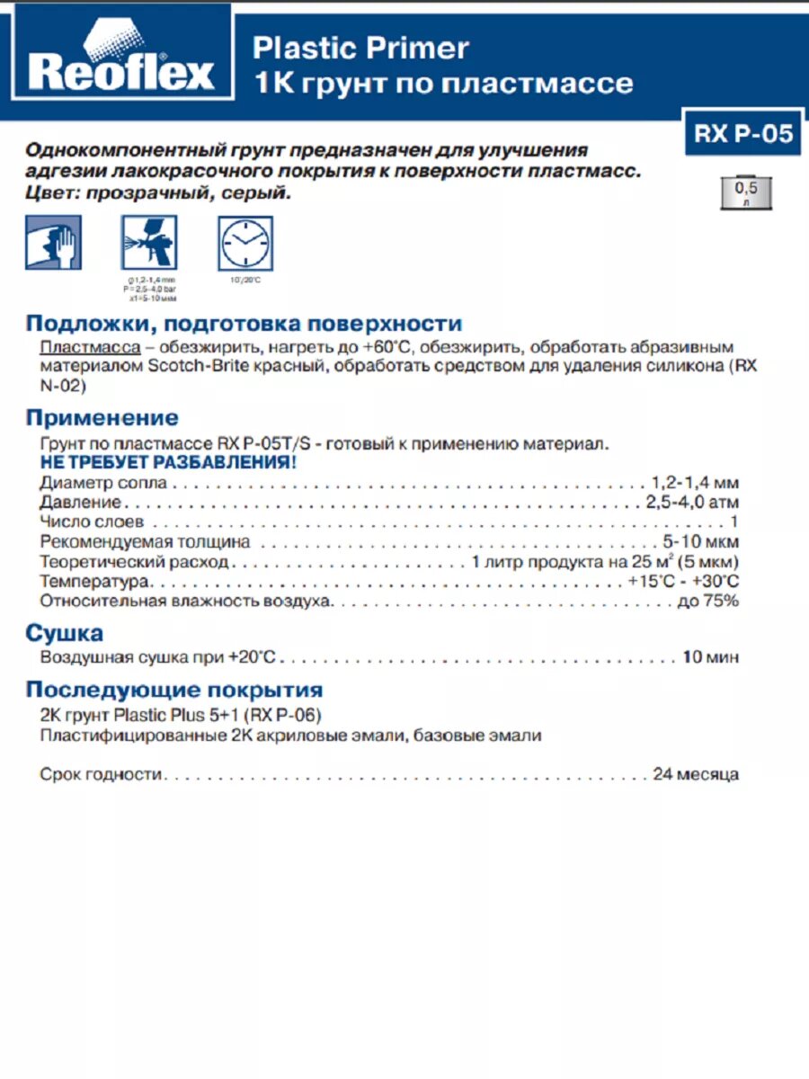 REOFLEX, однокомпонентный адгезионный грунт для пластика, который предназначен для улучшения адгезии лакокрасочного слоя к поверхности пластмасс. Грунт для пластмассы серого цвета. Грунт по пластику Reoflex RX P-05 Plastic Primer предназначен для получения высокой адгезии лакокрасочного покрытия к поверхности пластиковых (в том числе полипропиленовых) деталей автомобиля без применения обработки пламенем.Грунт для пластиков REOFLEX используется при ремонте лакокрасочного покрытия пластмассовых деталей автомобилей и любых пластиковых изделий. REOFLEX адгезионный грунт для пластиков, это хороший по качеству праймер для большинства типов пластика, который исключает шелушения лакокрасочного покрытия с поверхности пластика. Наносить грунт для пластиков REOFLEX краскораспылителем одним тонким слоем на заматированную абразивными губками (способ "по-сухому") или водостойкой наждачной бумагой Р800 (способ "по-мокрому") а также обезжиренную антисиликоном поверхность. Заправлять грунт в краскопульт необходимо только через фильтр-воронку. После 10 минут выдержки можно наносить акриловый грунт. Рекомендуем адгезионный грунт для пластиков REOFLEX для профессионального использования - хорошее качество при низкой цене.