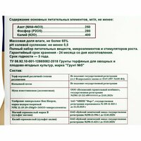 | Основные питательные вещества в мг/л, не менее | азот (NH4 + NO3) – 250; фосфор (Р2О5) – 280; калий (К2О) – 400; массовая доля влаги – не более 65%; pH солевой суспензии – не менее 5,5 |