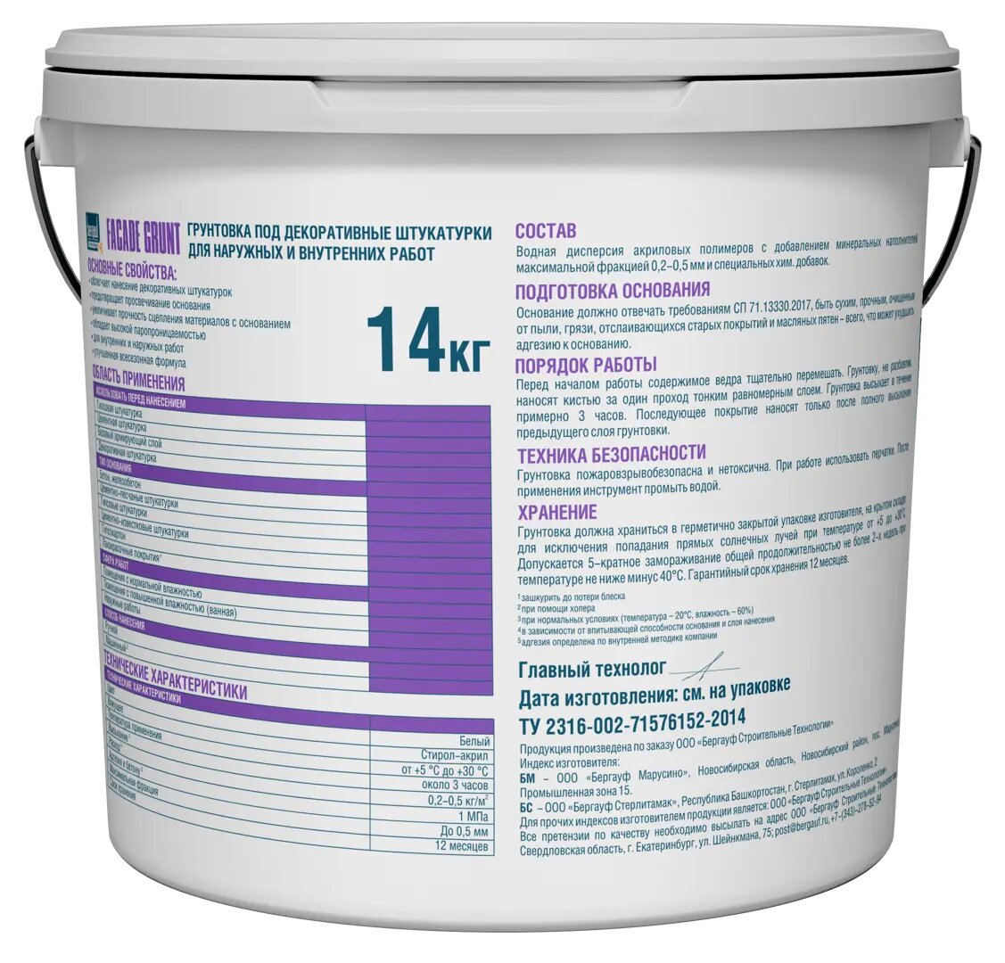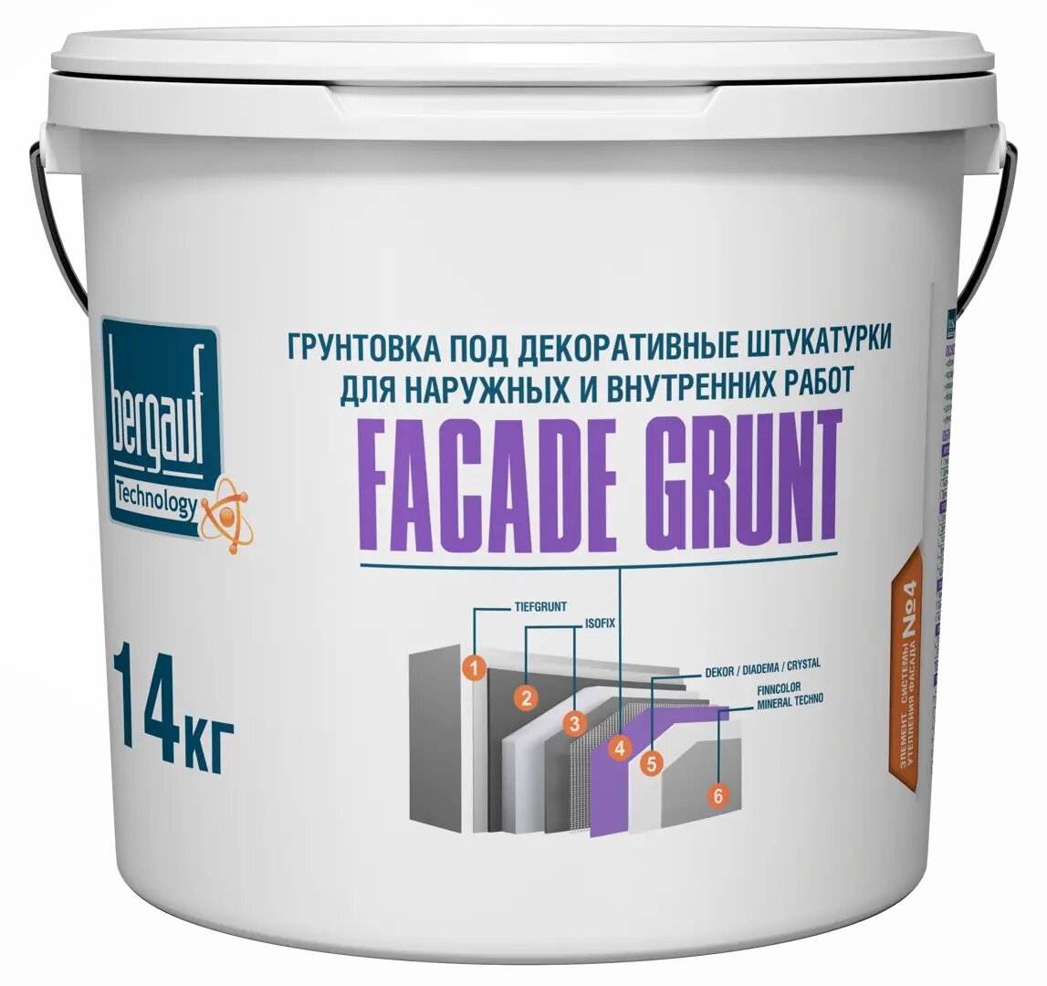 Грунтовка Bergauf Facade Grunt для наружных и внутренних работ 14кг - грунтовка под декоративные штукатурки для наружных и внутренних работ. Используется для увелечния сцепления финишных материалов с основанием, что обеспечивает высокое качество финишного покрытия.