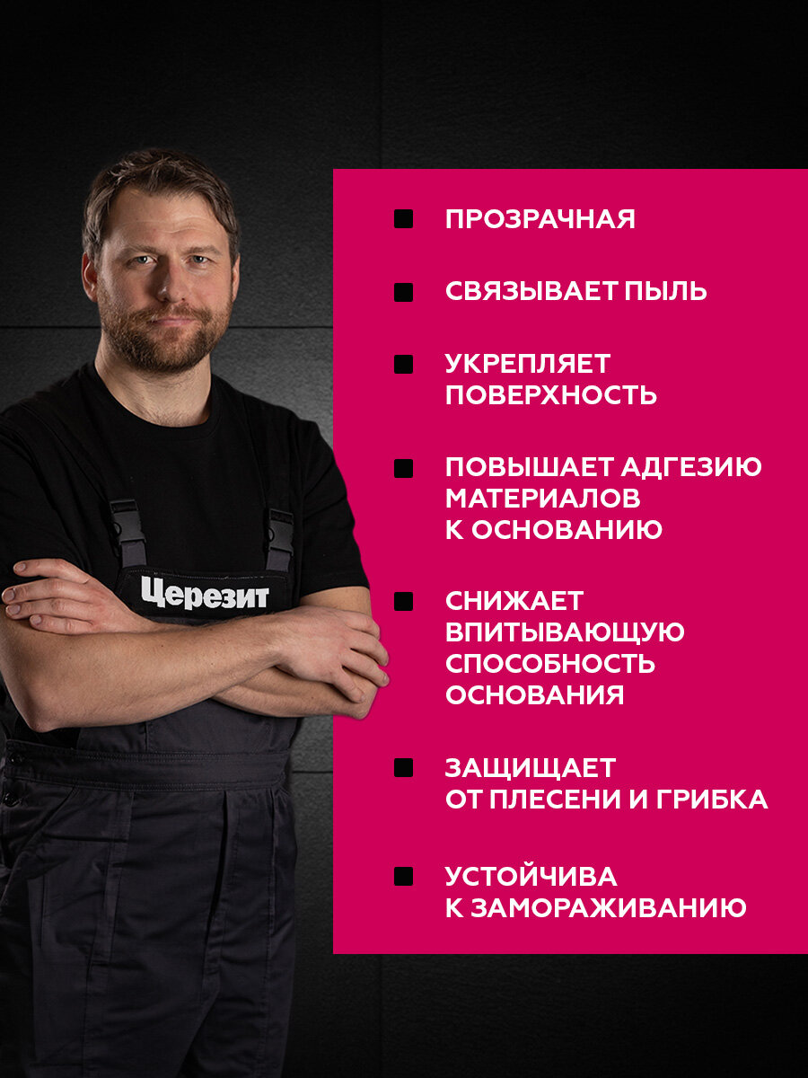 кирпича, природного камня, древесностружечных и древесноволокнистых плит, гипсокартона и т. п. - перед нанесением выравнивающих штукатурных и напольных смесей, плиточных клеев, полимерных гидроизоляционных мастик, креплением систем теплоизоляции фасадов (сфтк) и т. д. ОсобенностиУкрепляет основание и связывает пыльСнижает впитывающую способность основанияПовышает адгезию покрытий к основаниюБесцветнаПригодна для наружных и внутренних работНе содержит органических растворителей