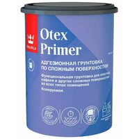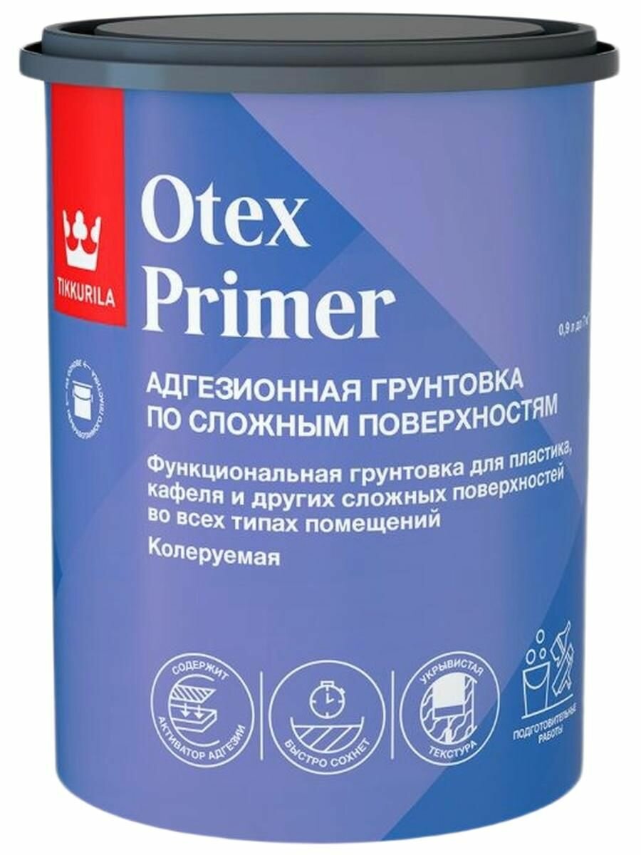 Tikkivala Tikkurila Otex Primer - адгезионная грунтовка по сложным поверхностям. Otex Primer предназначена для подготовки к окрашиванию поверхностей, нуждающихся в особо прочной адгезии, например, стекло, кафель, пластмасса на основе ПВХ, алюминий, оцинкованное железо во всех типах помещений.