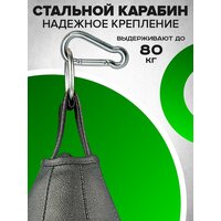Крепление груши выполнено в виде укрепленной лямки с карабином из оцинкованной стали, что обеспечивает надежность и безопасность использования.