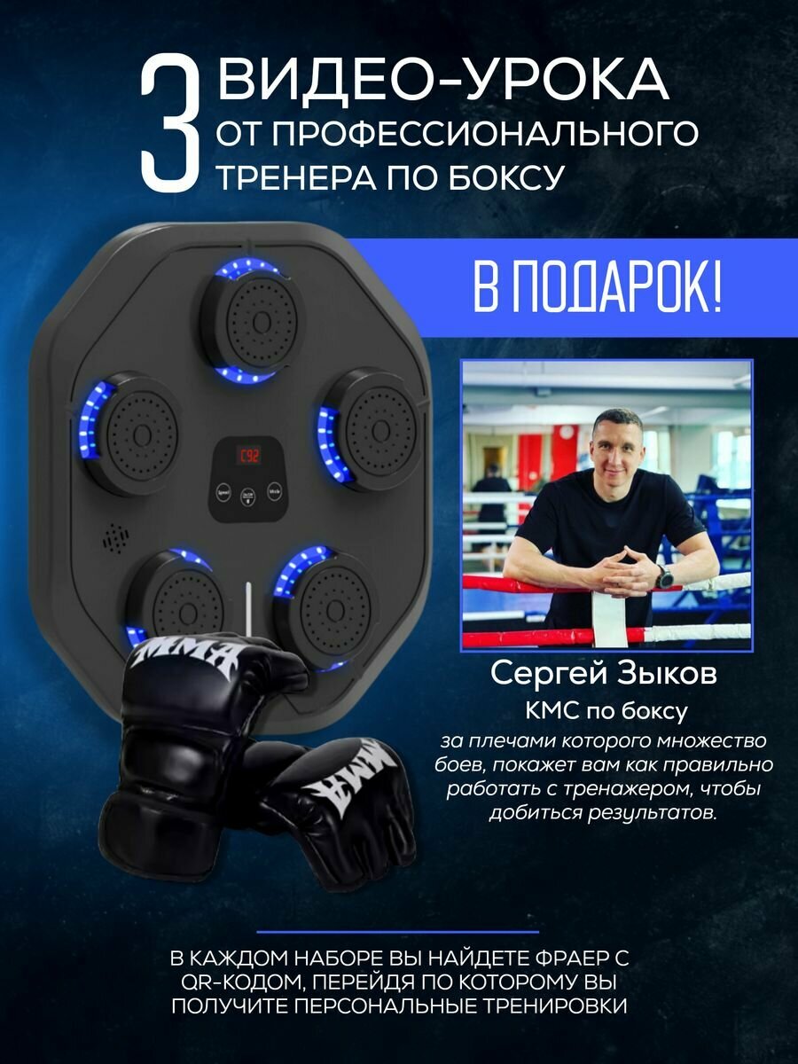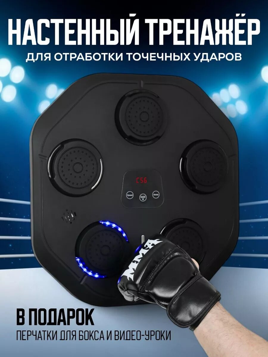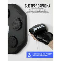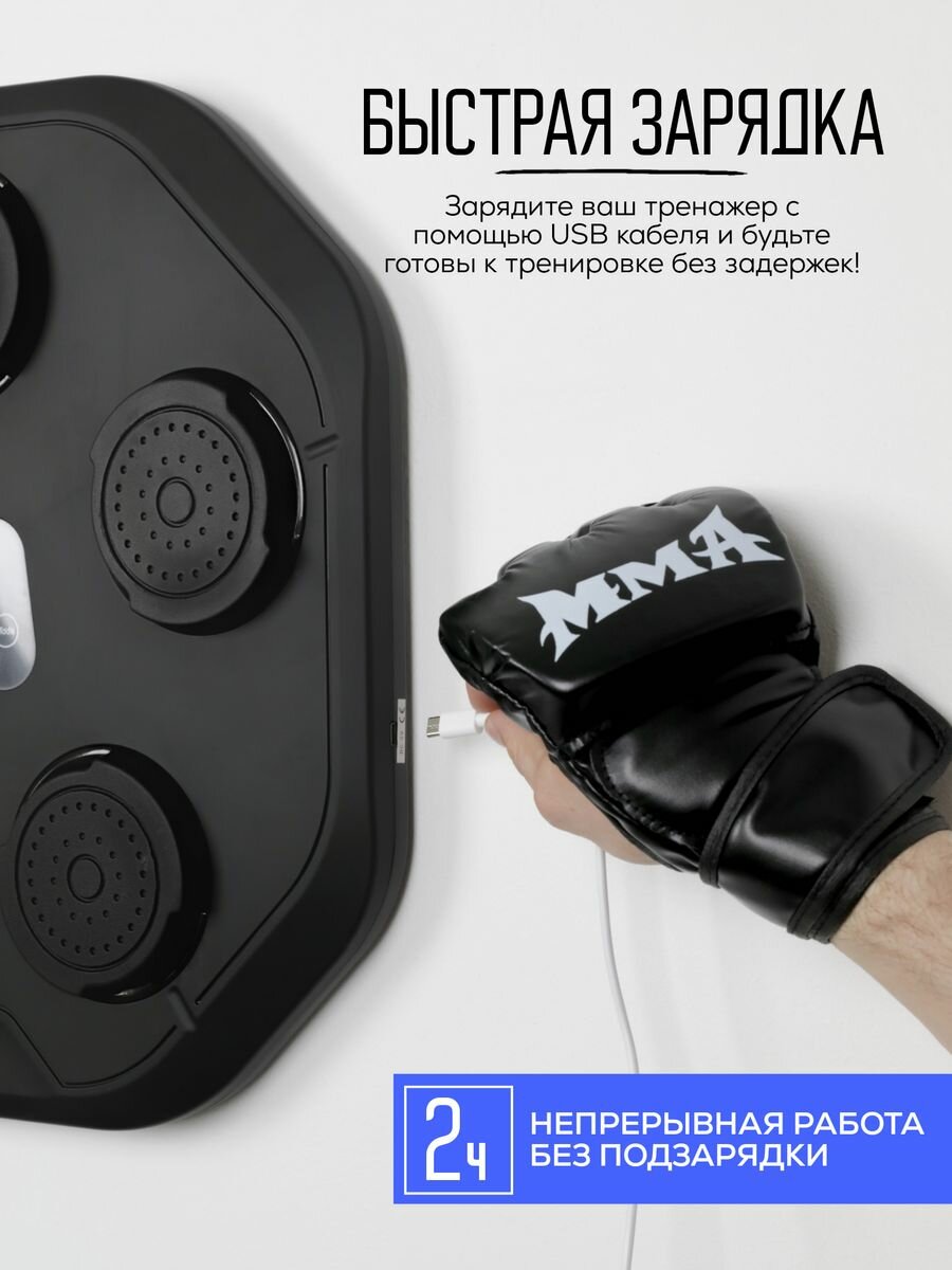Настенный тренажер не займет много места в вашем доме, при этом поможет всегда находиться в форме. Выполнен из прочного abs-пластика и мягкой резины. Крепится вертикально на стену на двусторонний скотч, является заменителем привычной боксерской груши. Имеет несколько скоростей и режимов сложности, оснащена музыкальным сопровождением. Подключить свою музыку вы сможете с помощью Bluetooth. Просто включите умный тренажер и начинайте домашнюю спортивную тренировку. Мишень будет подсвечивать, куда нужно бить. На удар вам дается около 1 секунды. На счетчике боксирования вы увидите их общее количество. Силовой тренажер является достойной альтернативой боксу и другим видам боев. Во время практики прорабатывают мышцы рук, плеч, предплечья и спины, а также укрепляется мышечный корсет, что снижает нагрузку на позвоночник. В комплекте идут перчатки MMA.