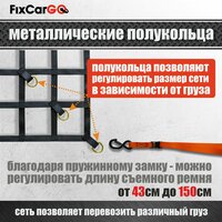 Размер сети легко регулируется за счет дополнительных рядов полуколец по периметру сети и стяжных ремней с пружинными замками, входящие в комплект сети, эти приспособления позволяют без усилий увеличивать или уменьшать площадь и угол крепления перевозимого груза за счет легкого перемещения пружинного замка, в том числе высокого груза, петля на конце ремня позволит обеспечить максимальное натяжение сети.