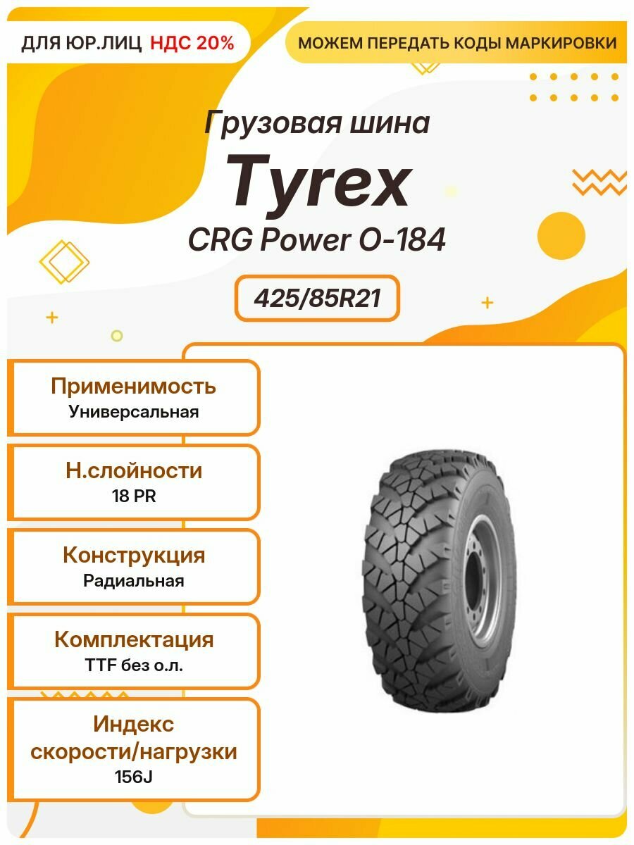 Купить Грузовая шина Tyrex CRG Power O-184, 425/85R21, 156J, TTF без о. л, Универсальная с доставкой по всей России. Грузовая шина Tyrex CRG Power O-184, 425/85R21, 156J, TTF без о. л, Универсальная: сравнение цен, характеристики, фото, актуальное наличие и цены.