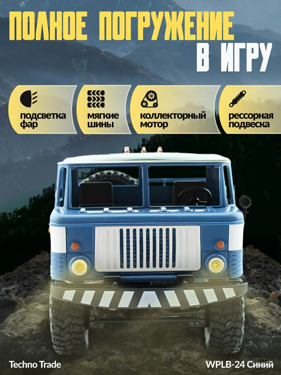 | Дополнительная информация | Радиоуправляемый внедорожный грузовик ГАЗ-66 имеет полный карданный привод и дифференциалы. Мосты установлены на металлических рессорах, что позволяет комфортно перевозить различные предметы по неровной дороге. Колеса с мягкими резиновыми шинами с агрессивным протектором позволяют миниатюрному грузовику без проблем преодолевать бездорожье и переезжать камни. |