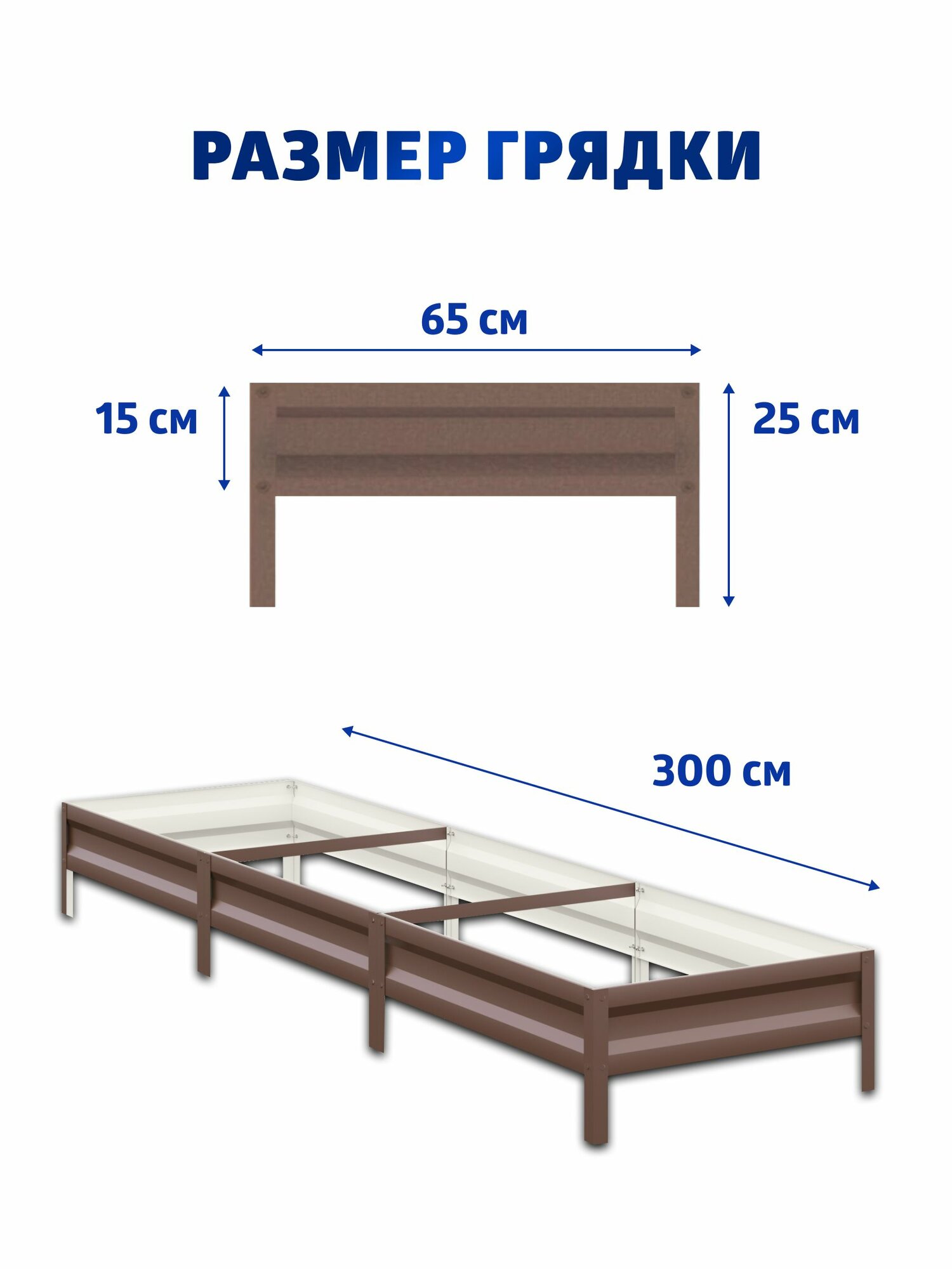 В комплект входят все необходимые элементы: уголки, стяжки, профиль и крепёжные болты. Завальцованные края обеспечивают безопасность. Высокие грядки способствуют лучшей аэрации почвы и защищают корни от заморозков и переувлажнения.