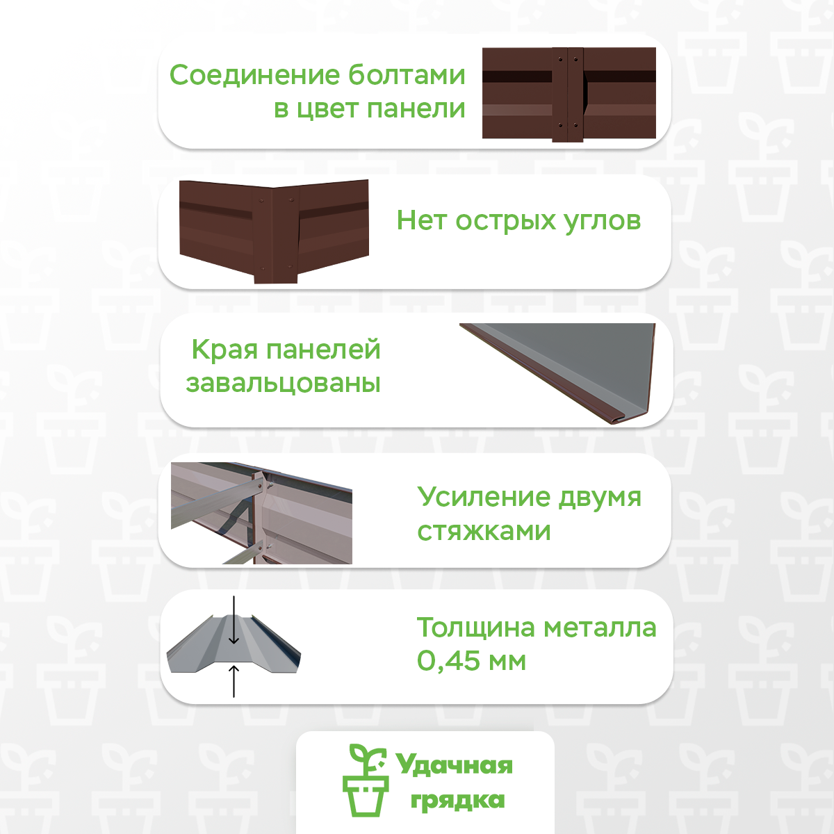 Удачная грядка – это металлическое ограждение из оцинкованной стали с полимерным покрытием. Произведена из металлопроката ведущих сталелитейных заводов России на современных автоматизированных станках. Удачные грядки пригодятся для: - дачников, которые ценят свой труд и время: металлические грядки не нужно убирать на зиму, они не боятся летней жары и служат в 3-4 раза дольше дерева. - облегчения Вашего труда: забудьте о необходимости пропалывать края грядки, ведь сорняки не растут на металле, также нет необходимости каждый раз при перекопке грядки делать борозды; - создания красивого и благоустроенного участка: полимерное покрытие сохраняет свой цвет и не выгорает на солнце долгое время и выглядит во много раз эстетичней по сравнению с деревом; - увеличения урожая: грядки из металла лучше прогреваются, поэтому растение получает больше тепла; - борьба с болезнями: металл не подвержен гниению, болезнетворные организмы не размножаются на нем. Преимущества Удачной грядки: - изготовлена из оцинкованного металла с полимерным покрытием выбранного цвета толщиной 0,5 мм; - каждая панель имеет 8 ребер жесткости; - все острые края панелей завальцованы внутрь для предотвращения порезов; - усиление двойными стяжками между панелями;- легкая сборка на болтах (нужен только ключ на 8 и крестовая отвертка). Наши грядки помогут Вам освободить Ваше время и украсить участок! Они завоюют Вашу любовь! Комплектация грядок указана в описании. Убедительно рекомендуется ознакомиться с инструкцией для правильного соединения элементов грядки между собой! Нажмите на логотип компании, чтобы ознакомиться с другим ассортиментом магазина.