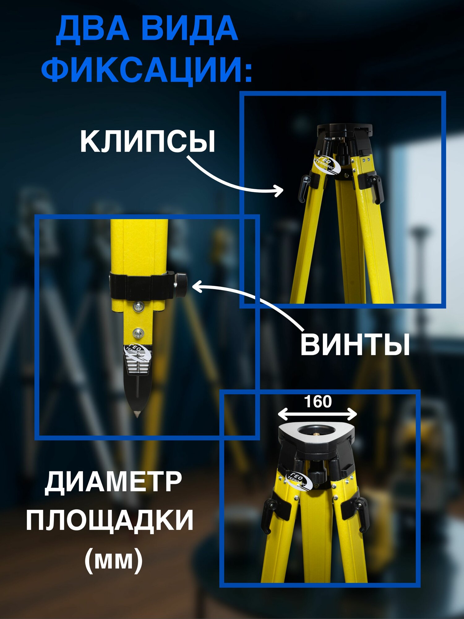 Плоская треугольная площадка диаметром 160 мм оснащена становым винтом 5/8", обеспечивая совместимость с большинством геодезических приборов. Благодаря двойной системе фиксации ножек — зажимам типа «Клипса» и «Винт», штатив быстро настраивается и надежно фиксируется даже на неровной поверхности.