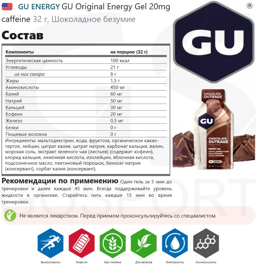 GU ENERGY GU Original Energy Gel 20mg caffeine 8 x 32 г, Шоколадное безумие: сравнение цен, характеристики, фото, актуальное наличие и цены.